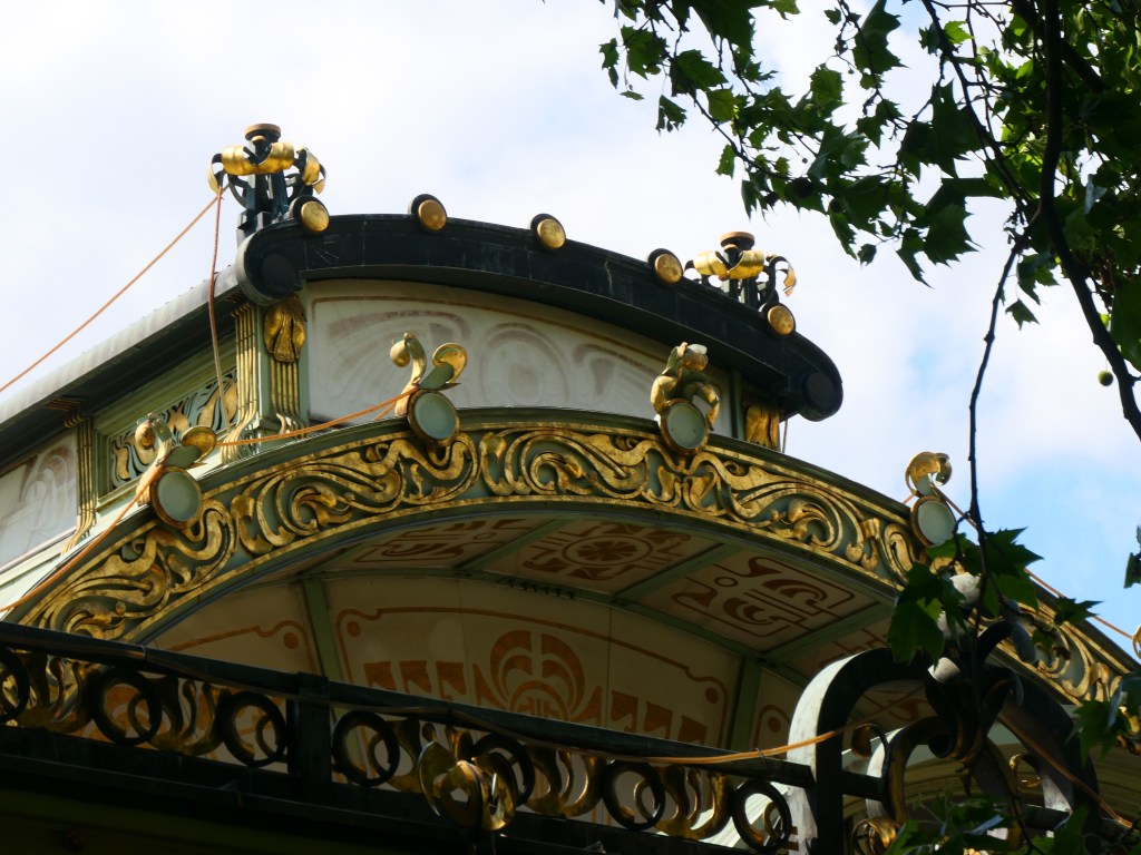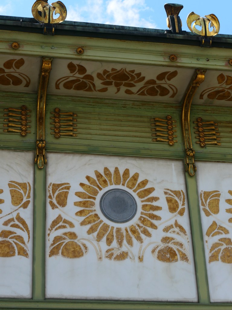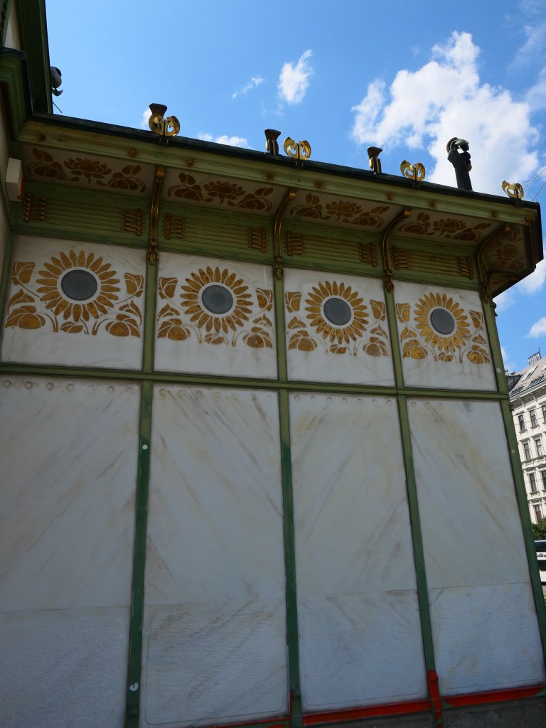 Les pavillons de la station de métro Karlsplatz présentent une structure en fer forgé peinte en couleur vert pomme, la couleur de la Stadtbahn qui porte des dalles de marbre blanc de Carrare ornées de fleurs de tournesol de couleur noir et or et de cartouches dorés.