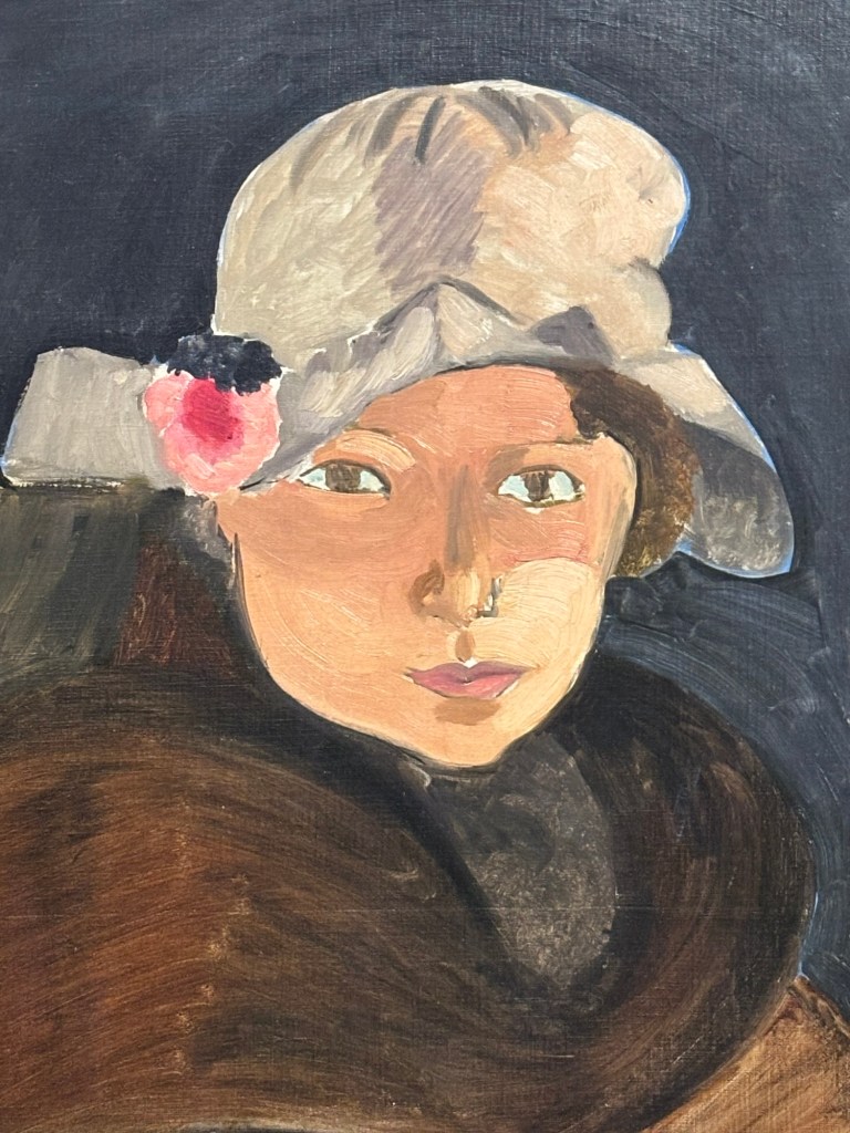 Puis d’autres portraits où Marguerite est assise dans un manteau écossais ou encore dans un autre manteau marron. Toujours avec un chapeau sur la tête. Ce qui parfois lui donne un air bêta. Mais un regard profond vous transperce.
