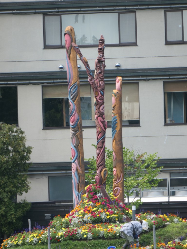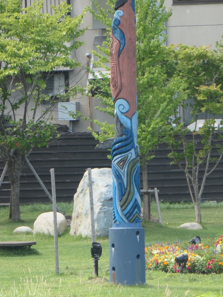 Mais aussi sur le bord du lac Akan devant un hôtel se trouve un cercle spirituel réalisé en forme de serpent fleuri avec juste à côté des totems spirituels bleus, roses et marrons représentant des déités.