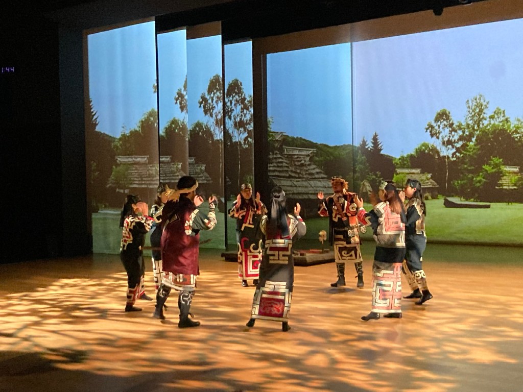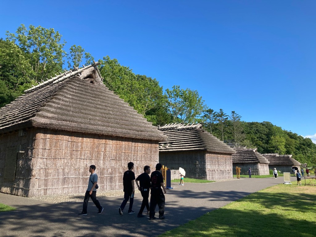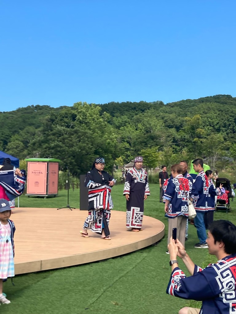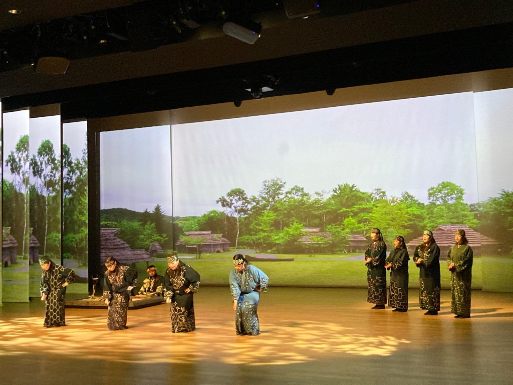 De plus une exposition dans le bâtiment central est organisée autour de six thématiques : langue, spiritualité, vie quotidienne, histoire, métiers et échanges. Le Kotan, village traditionnel permet de visiter les huttes où vivaient les aïnous et de découvrir leur mode vie. Et surtout de pouvoir assister à des danses traditionnelles dites des grues. Nous sommes revêtues de blouses bleues et en bougeant les bras formant des sortes d’ailes pour l’envol de l’oiseau avec des chants qui sont des sortes de cris d’oiseau.