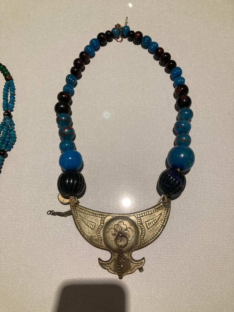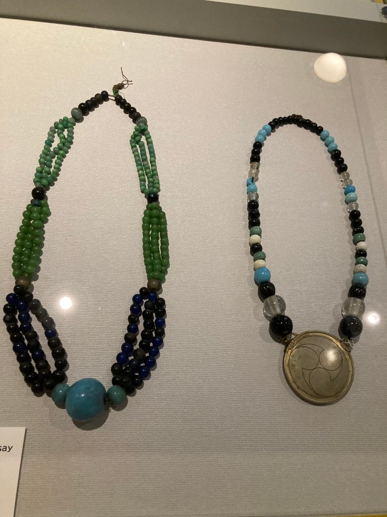 On y découvre aussi les accessoires rituels – bijoux portés par les femmes : les boucles d’oreilles, les bandeaux sur le front brodés, les colliers faits de matériaux de verre en couleurs différentes que l’on appelle des Tamasay parfois agrémenté d’un pendentif en métal nommé Tamasay avec Shitoki.