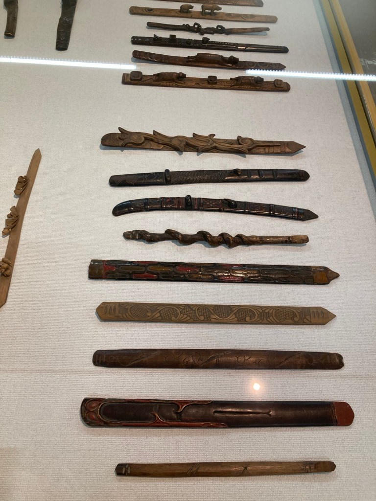 Mais aussi le tambour pour les chamanes et les bâtons de prières, spatules des cérémonies. Ils servaient les offrandes sur l’autel et la spatule servait à atteindre et transmettre les demandes auprès des esprits.
