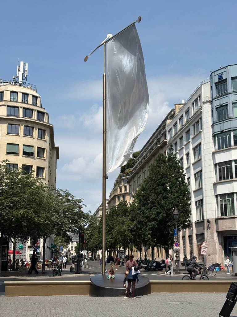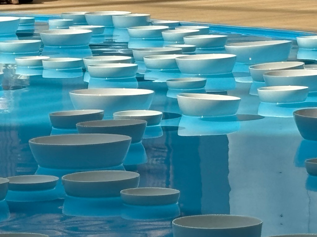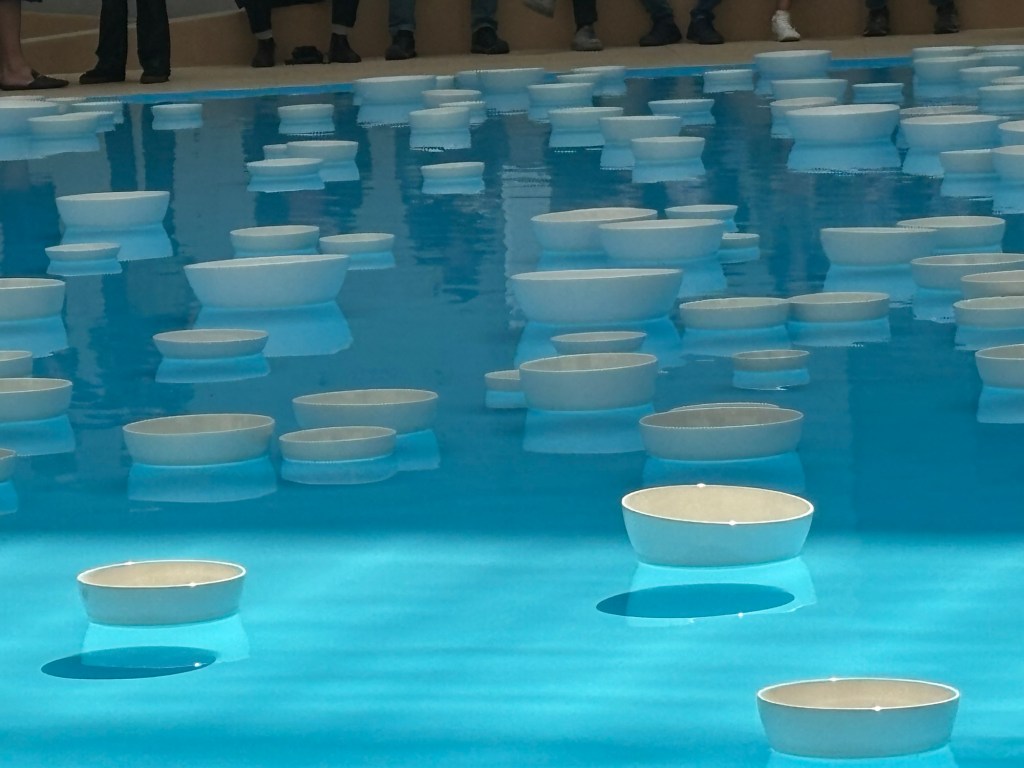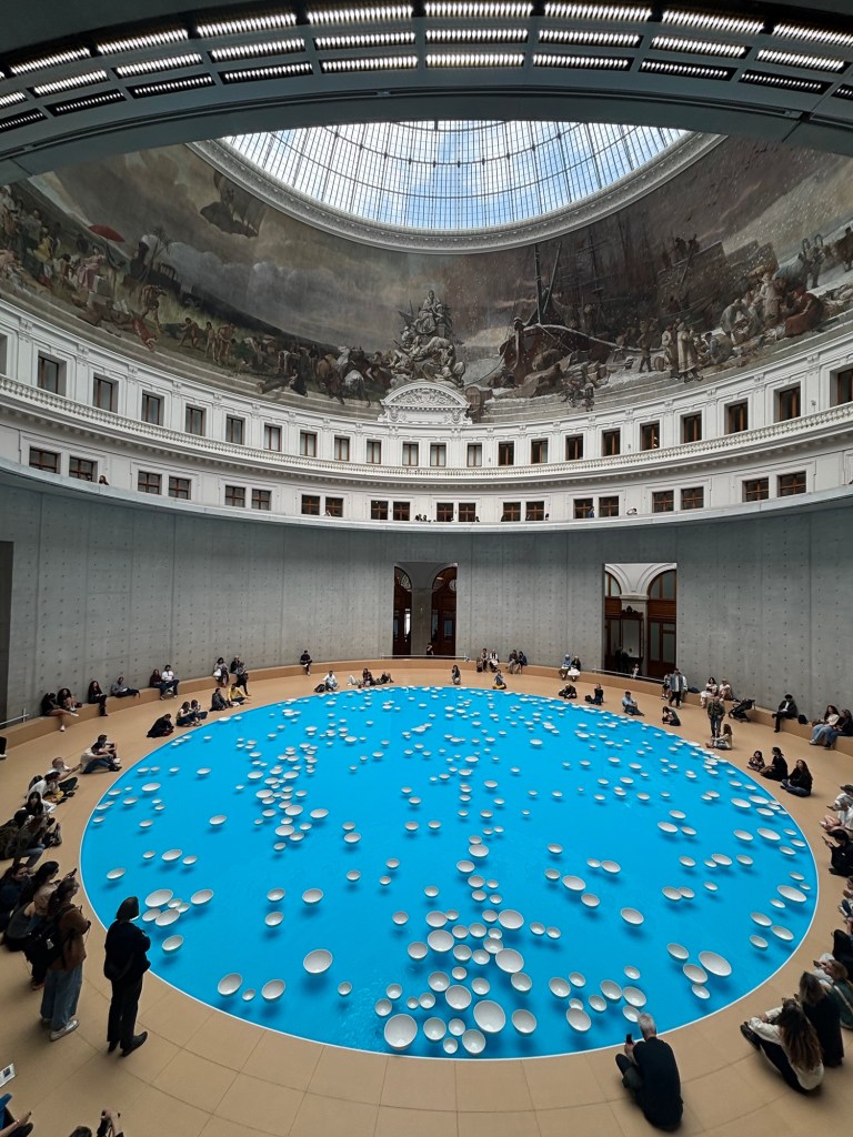 Puis la forme arrondie de la bourse vous happe à travers son couloir et surtout la coupole de verre vous surprend du fait de la clarté du site qui se reflète dans l’œuvre aquatique au sol. Une eau bleu turquoise – couleur des Antilles – où voguent des assiettes de tailles différentes qui en bougeant se choquent et vous offrent une sonorité qui vous détend et vous fait entrer en transe. On regarde les assiettes tourner, avancer, se choquer et donner un son digne des sirènes. Je suis restée captivée par ce lieu et comme beaucoup de visiteurs nous écoutions avec une forme de spiritualité cette musique psychédélique. Le titre de l’œuvre est Clinamen tiré de la physique épicurienne et fait référence à la trajectoire aléatoire des atomes. Moment de grande pureté et de détente.