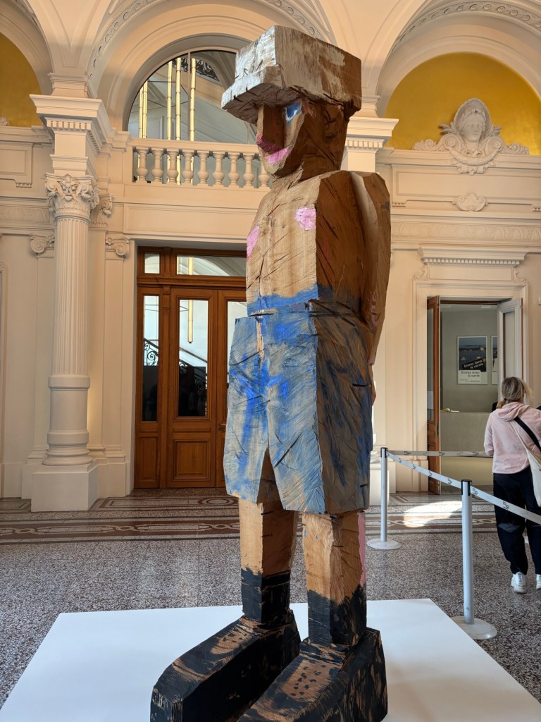 Quand on entre dans le musée on est accueilli par un grand monsieur style homme de l’ile de Pâques tout de bois coloré ! Cela fait tout drôle car il est très sérieux !