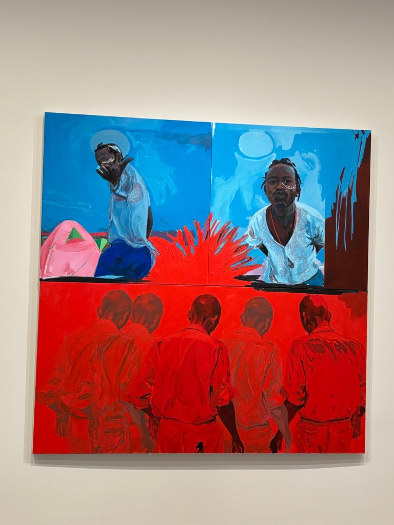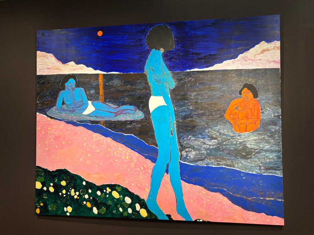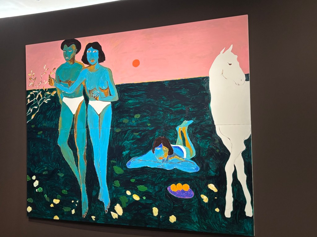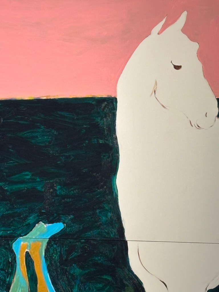 Et enfin nous découvrons dans la première salle deux œuvres de Gideon Appah qui traite de la représentation des corps. Corps longiligne bleu sur la plage ou sur une ile et l’autre avec ce cheval blanc qui m’a marqué. La virginité blanche de ce cheval attire l’œil et transcende le tableau.