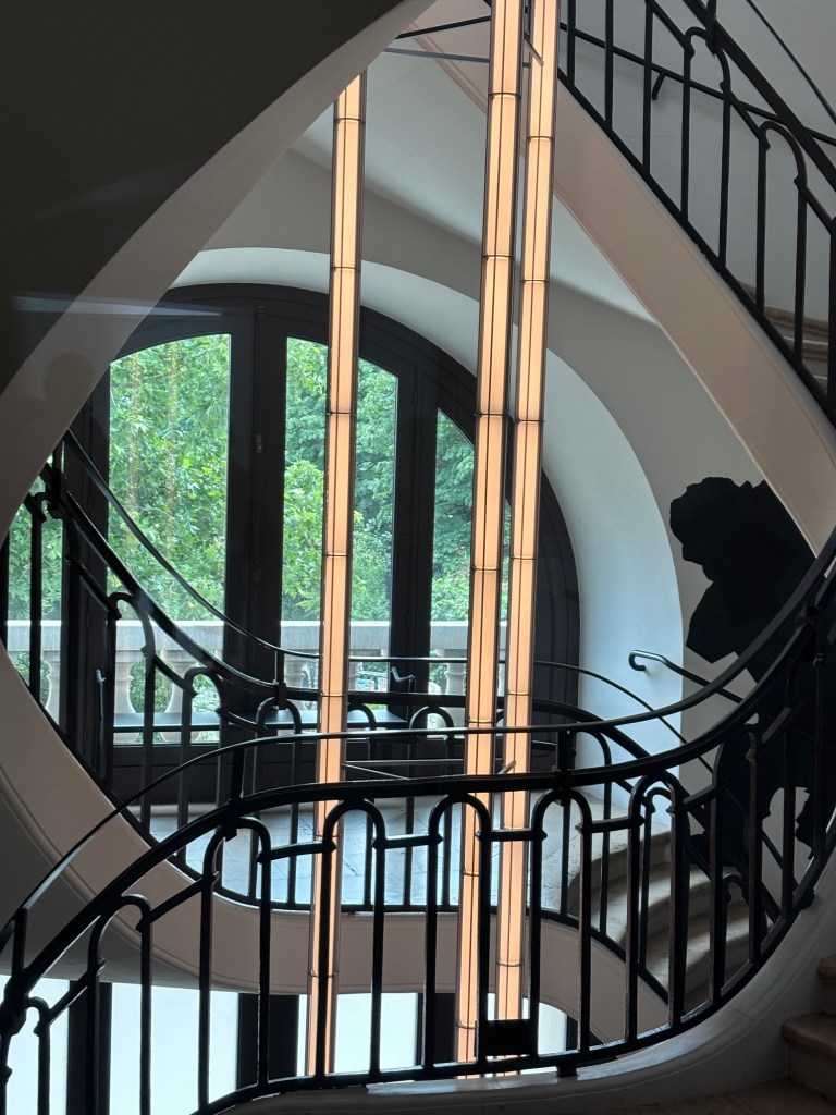 Mon œil a aussi été attiré par la pureté des formes de l’escalier et la partie noire comme si un inconnu ou un fantôme nous précédait.