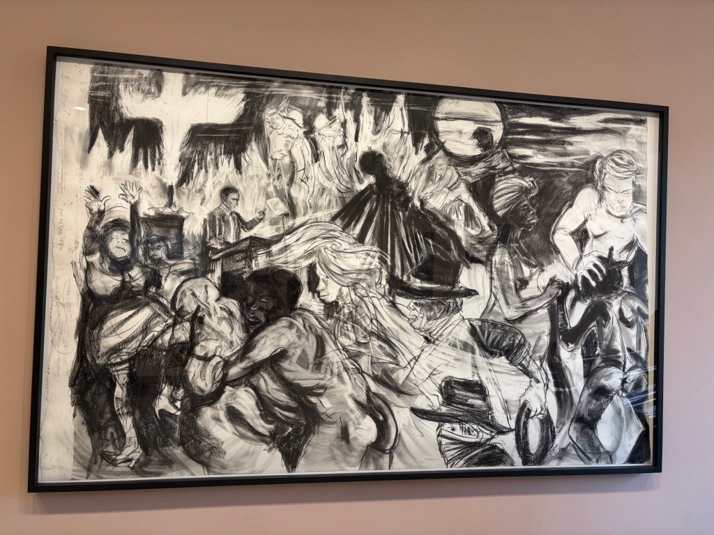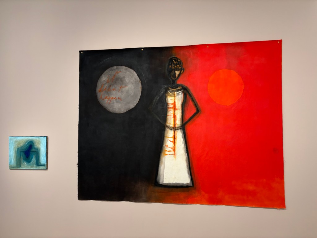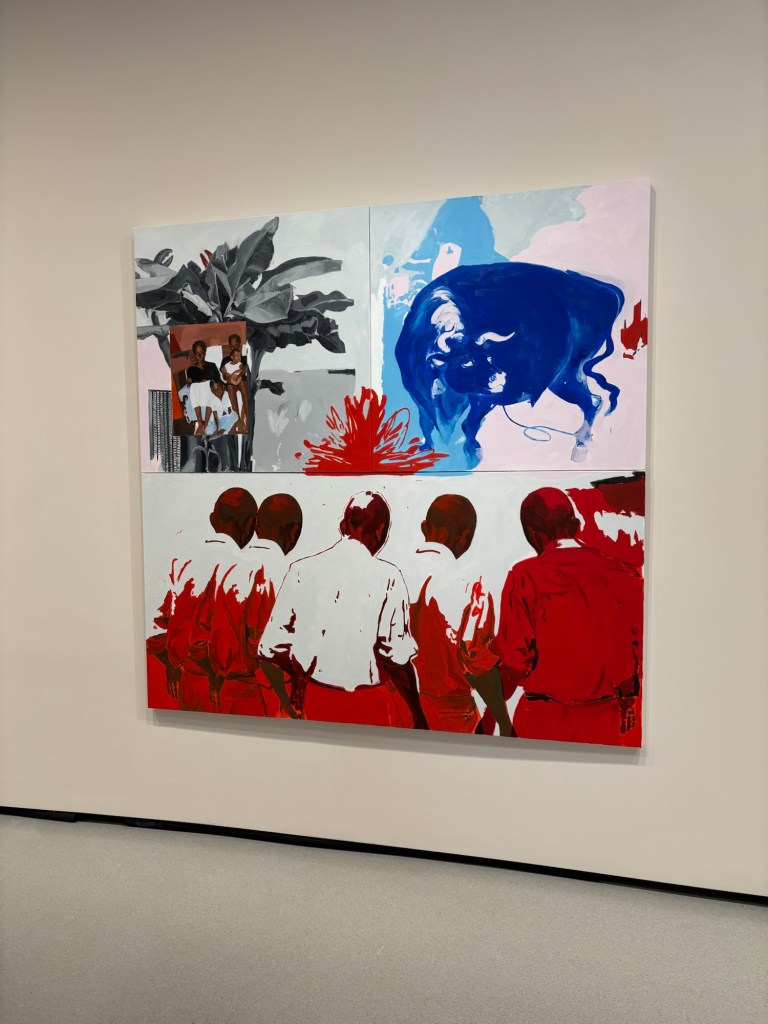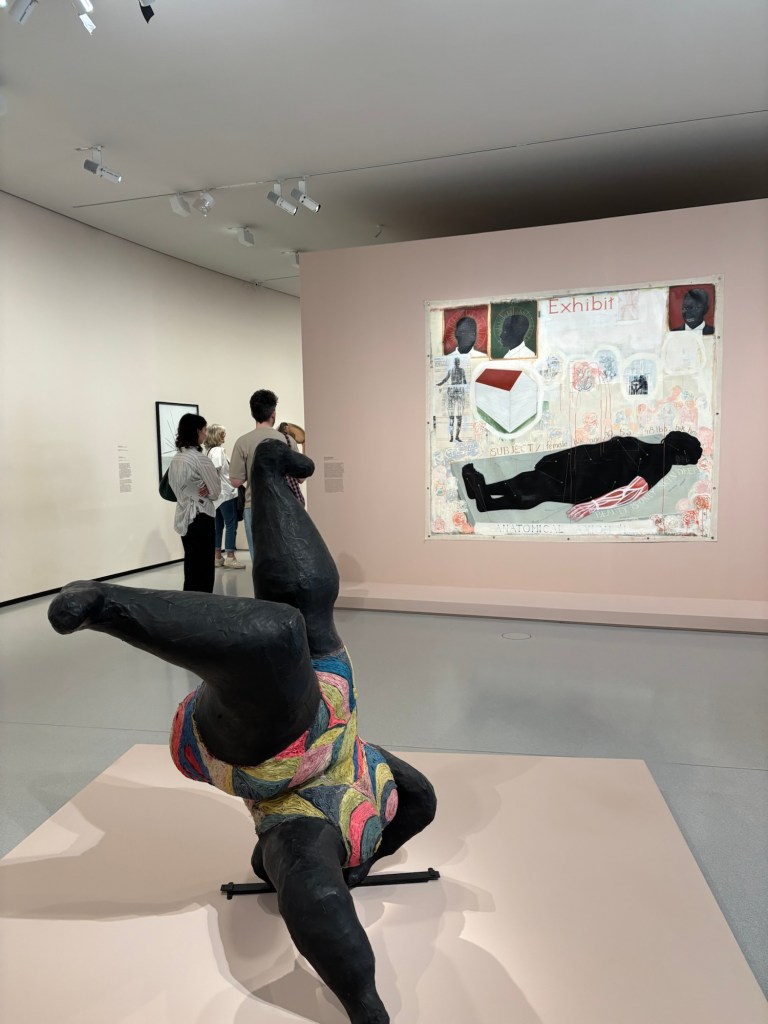 Comme ce grand tableau qui me fait penser à Guernica de Picasso, tout noir, avec des êtres humains des animaux ; ou bien à travers l’œuvre de Niki de Saint Phalle « Nana noire » qui regarde la tête à l’envers la « Beauty Examined » de Kerry James Marshall, corps exhibé vivant comme mort à des fins sexuelles et racistes ; ou bien Torn de Mira Schor, cette forme dans l’ombre et la lumière entre soleil et lune qui exhibe son corps blanc d’où le sang coule : et ces deux tableaux qui se font face en rouge et en blanc pour marquer la violence, visages de femmes effacées, remplacées par un taureau et une photo de famille. Toujours les corps exposés !