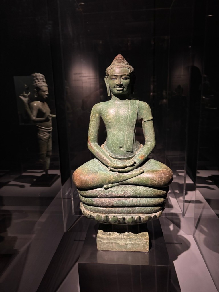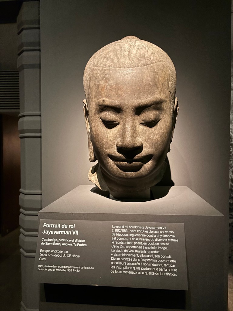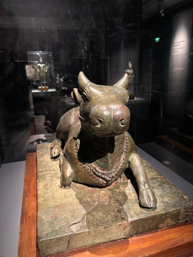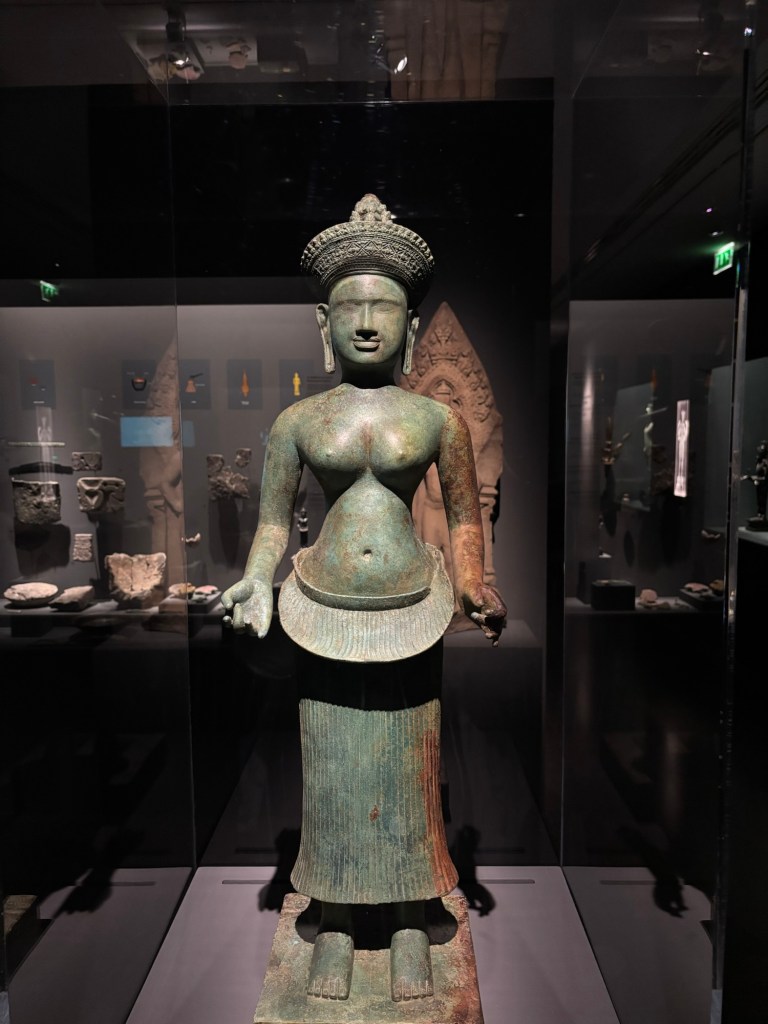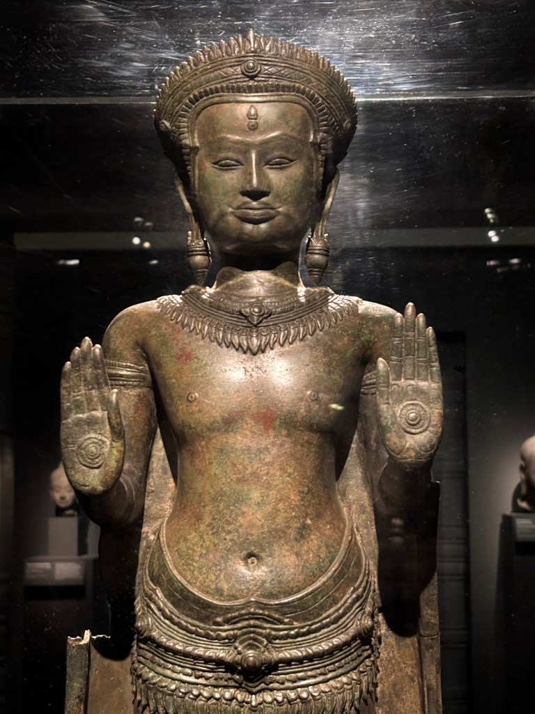 Cette exposition était consacrée aux bronzes royaux et à l’art divin des Khmers. Divins car nous errons entre le bouddhisme et l’hindouisme qui ont une ampleur particulière à Angkor Vat et qui nous présente le syncrétisme de ces deux religions.