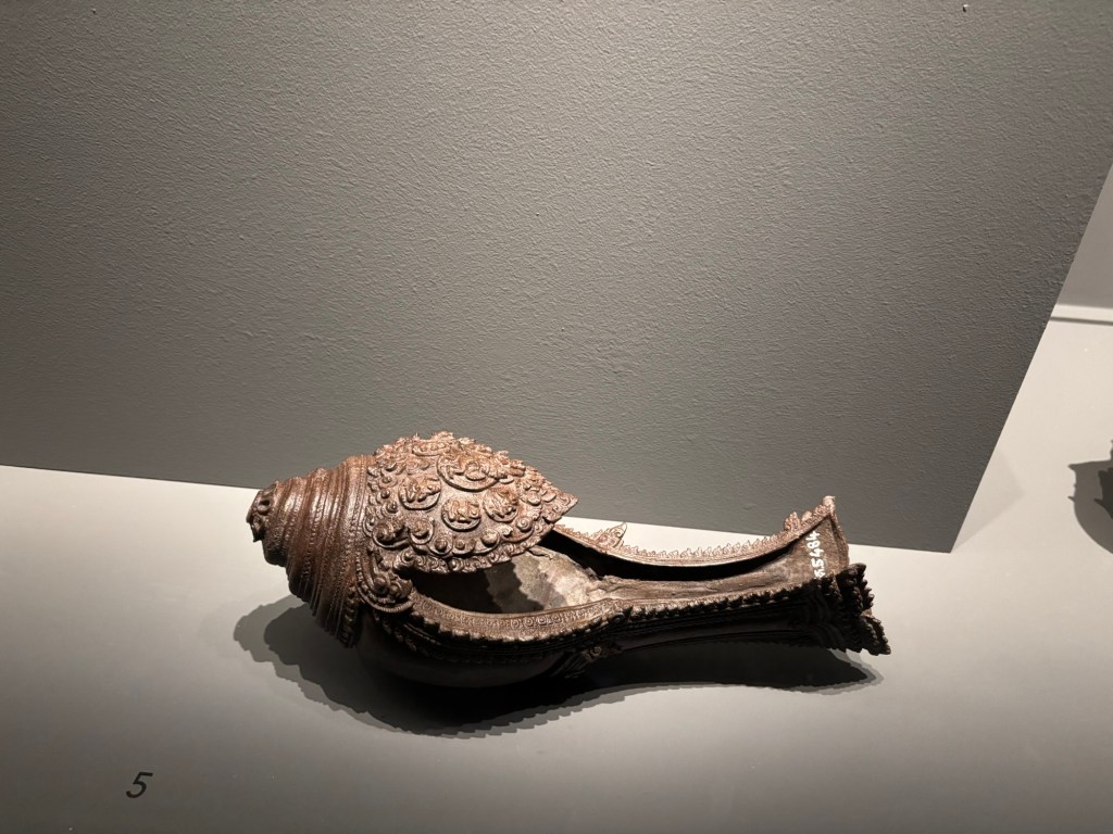 La conche et le personnage féminin agenouillé qui fait penser à une apsara (danseuse khmer).