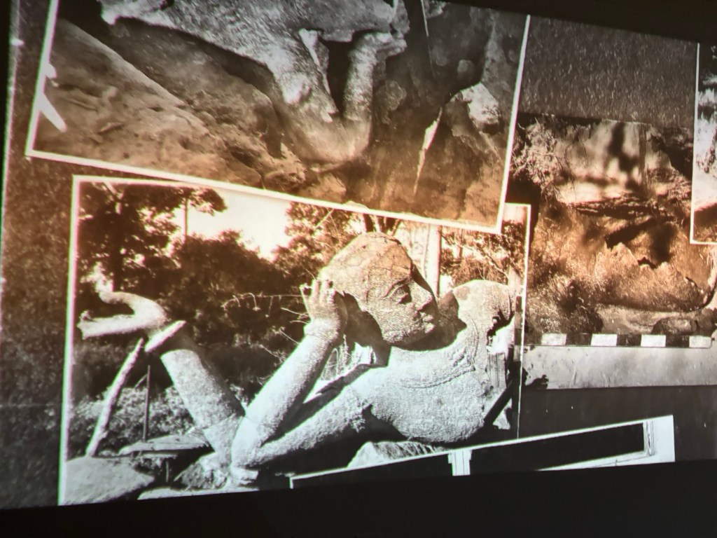 Et le clou de l’exposition au rez-de-chaussée est le Vishnou du Mebon occidental qui renait de son histoire. Pour la petite histoire une personne nommée Chhit-Lat a fait un rêve, Bouddha lui est apparu et lui a demandé de le libérer de la terre qui l’étouffait et des pierres qui l’écrasaient en précisant le lieu (le terre-plein central du Mebon). Apres creusement on découvre le Vishnou en position couchée ou allongé sur le serpent Ananta – le Dieu sommeille à la suite de la destruction de l’univers. A son réveil, au cœur d’un lotus émanant de son corps, le dieu Brahma énonce les vedas de la nouvelle création du monde. Grâce à la coopération franco-cambodgienne le buste et les fragments disponibles ont été restaurés et sont exposés au musée Guimet pour cette exposition. Juste impressionnant de beauté et les détails de son dos sont magnifiques.