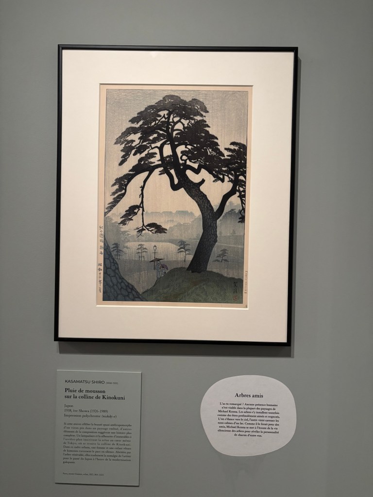 Il est inspiré par les arbres pris de face et me font penser à l’arbre de Wanaka en Nouvelle Zélande plongé au milieu du lac. Il les prend aussi par en dessous comme j’adore faire pour donner l’ampleur des branches et de la couverture du monde naturel. Cet arbre est présenté avec une impression polychrome de Kasamatsu Shiro « Pluie de mousson ».