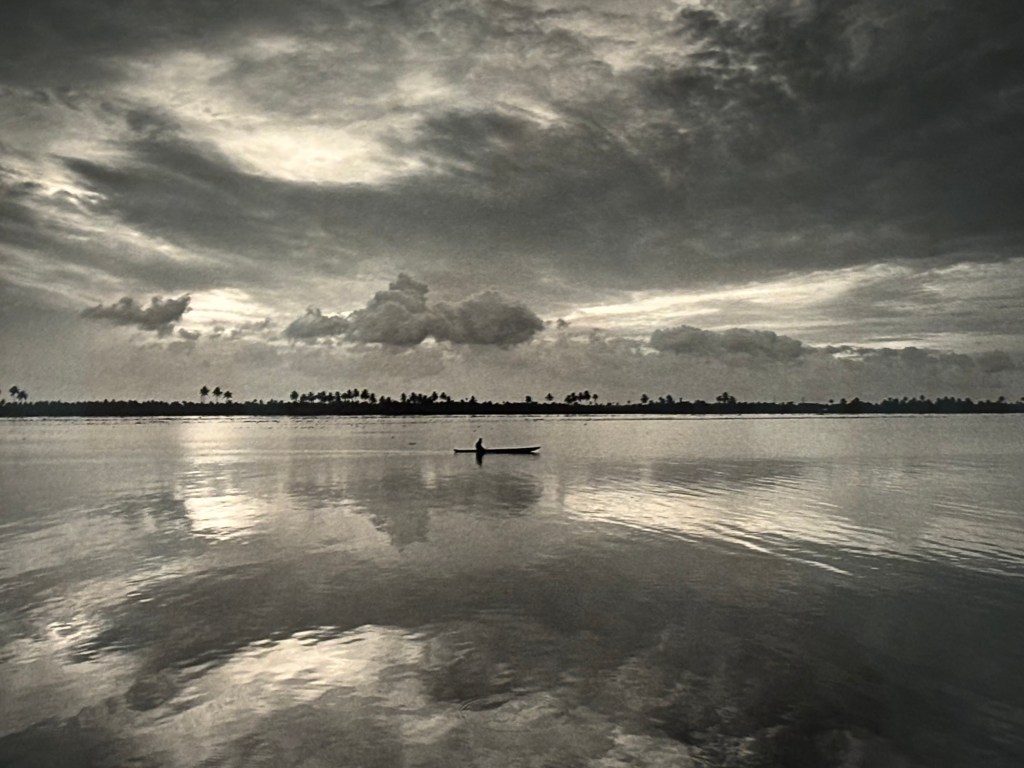Ce lac dont les nuages noirs, arrondis se reflètent et forment un tout. Cet homme au milieu sur la frêle barque qui est enrobé par cette eau et ce ciel menaçant. Je suis happée par ce paysage et je le trouve envoutant.
