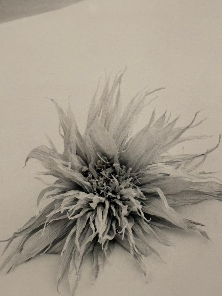 Et cette fleur de papier de maki à Hokkaido sur la neige comme une étoile de mer qui rampe sur la blancheur pure du sol. Quand on regarde de près cette fleur on dirait des tentacules lancés en l’air. Cette fleur est posée, gelée mais tellement présente qu’on a envie de la cueillir ou de la laisser là où elle est. Elle marque la solitude et la fragilité du monde où nous vivons.