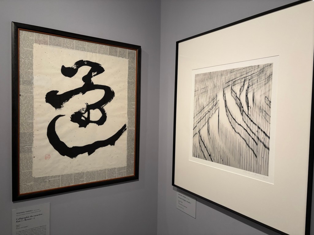 Très belle photo que celle des fermes d’algues en Chine qui dessinent des lignes noires dans la blancheur de la neige – traits calligraphiés serrés juste en face d’une calligraphie de Teshima Tairiku « Kan ». Là aussi c’est envoutant à la limite du spirituel.