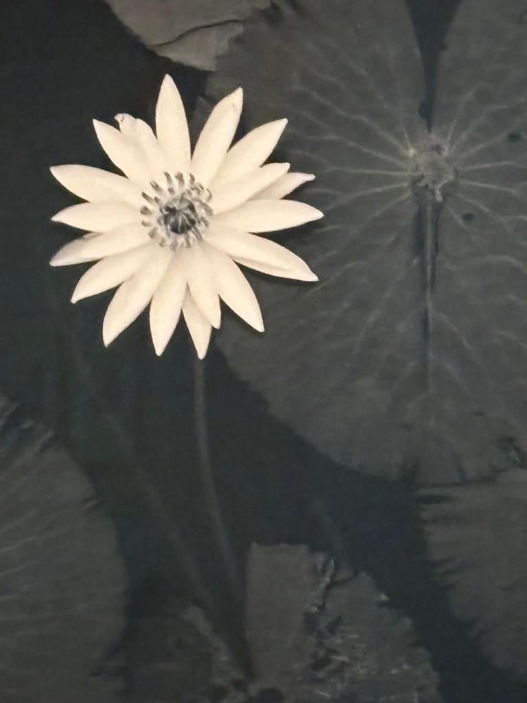 Et je finirais avec ces fleurs dites « deux tiges en hiver » dont les pointes sont rouges perdues dans cette immensité blanche et le lotus blanc sur fond noir et feuilles noires. En la prenant de près on peut admirer les pistils de la fleur de lotus et la finesse des tiges.