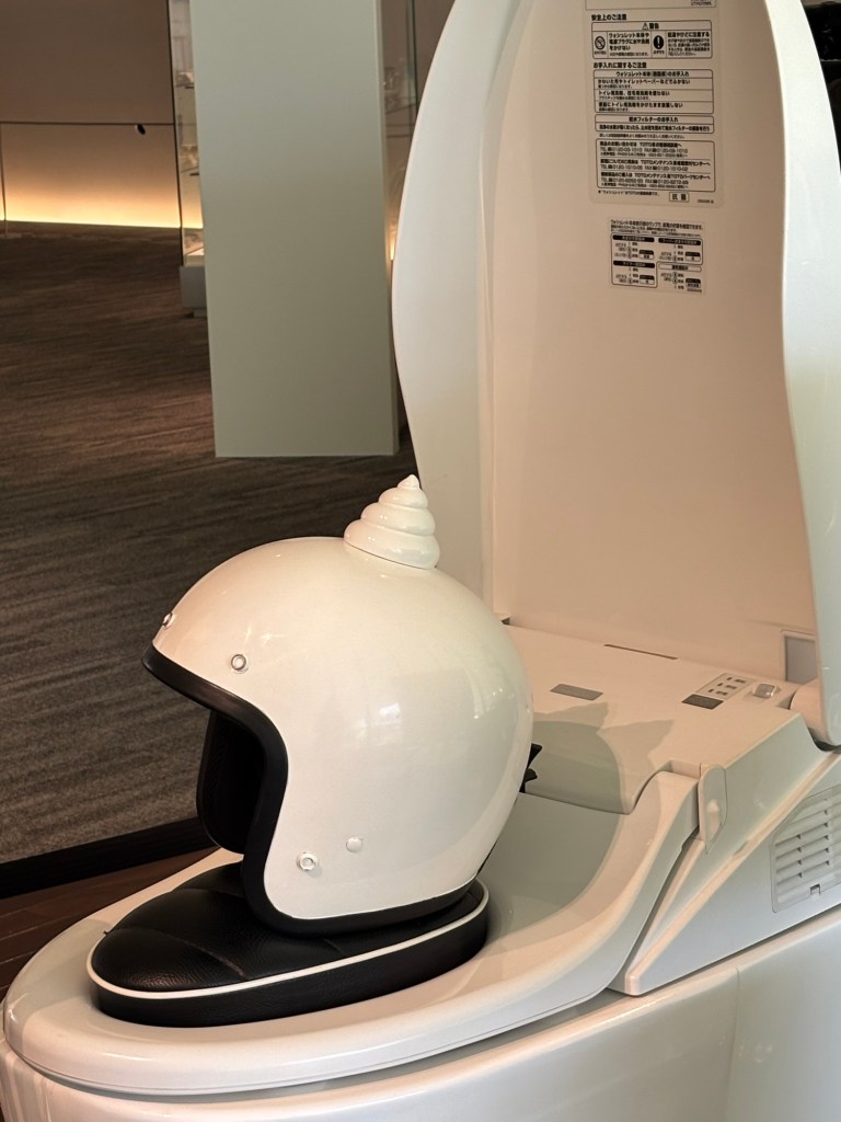 Là où j’ai été morte de rire fut la présence de la moto WC dont le casque blanc avait une crotte blanche sur le dessus. Je n’avais encore jamais vu de moto avec des WCs et j’ai trouvé cela représentatif de la créativité japonaise. Il fallait l’inventer et ils l’ont fait ! Il en faut pour tous les goûts et les besoins de la vie courante. Quel humour ! Ce ne sont pas les motocrottes pour les chiens mais pour les hommes en déplacements.