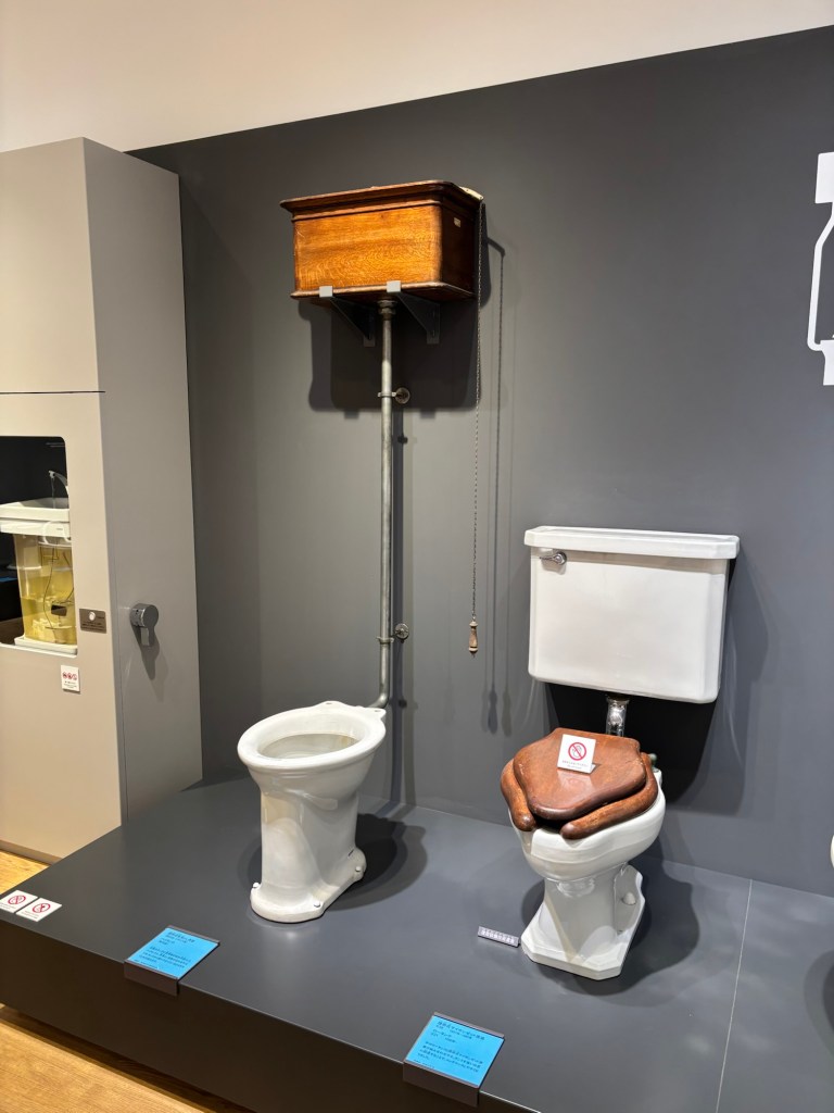 Puis le musée expose des cuvettes de WC en porcelaine avec leurs sièges en plastique. Il y a même des exemples faits en carton fleuris.
