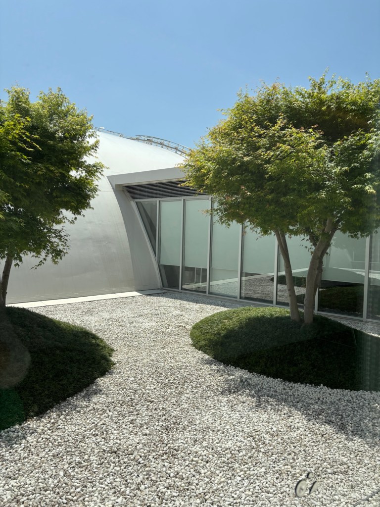 Tout est blanc en extérieur comme en intérieur. Très aseptisé et incroyablement intéressant. Avec une cours intérieure zen avec deux arbres plantés de chaque côté.