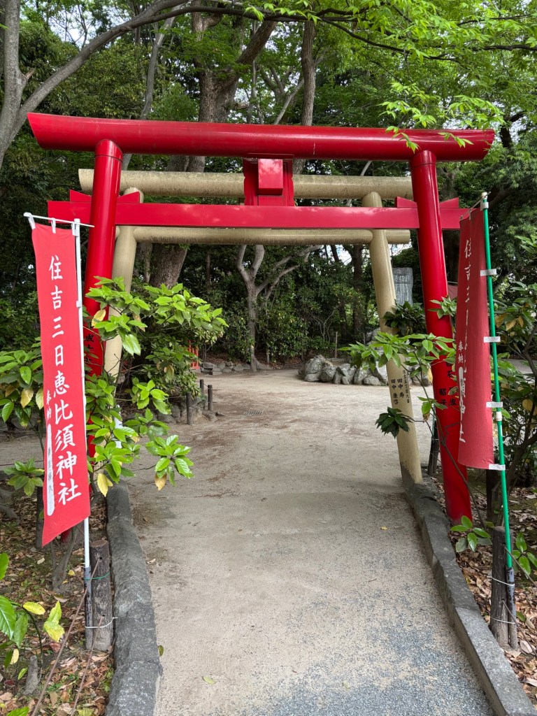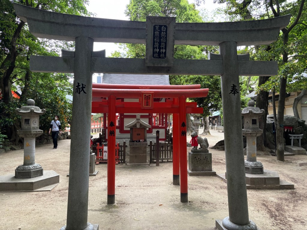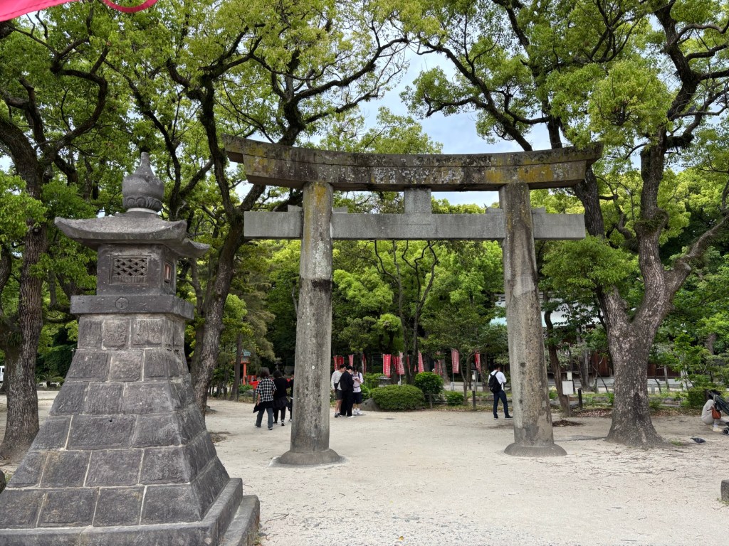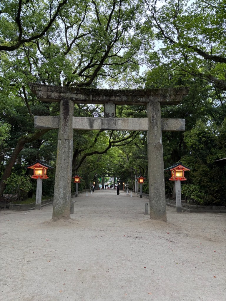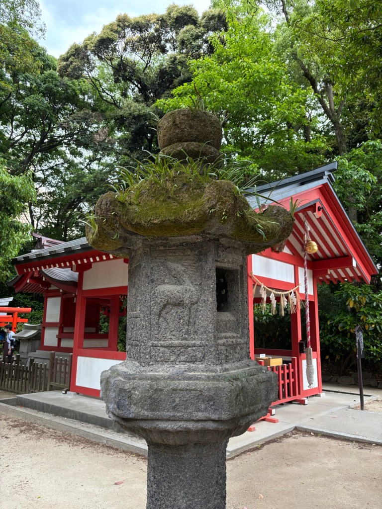 Sur la grande artère qui traverse Fukuoka mon œil a été attiré par un Tori en pierre entourés d’arbres et de deux tours en pierre avec une boule, sorte de gardien du temple je suppose.
