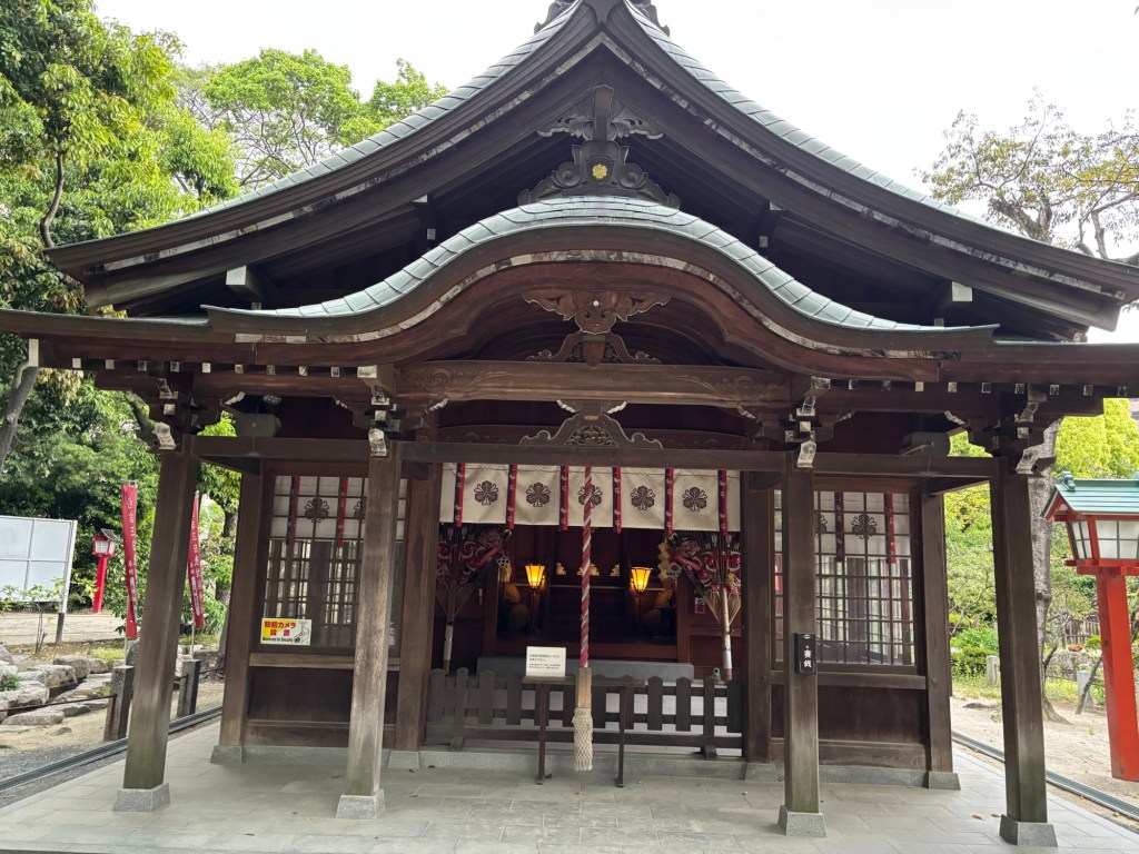 Temple qui a été reconstruit en 1623 par Kuroda Nagamasa, premier lord u clan de Fukuoka, sous la forme architecturale ancienne. Le temple est un théâtre Noh ou Nô – théâtre basé sur la conception religieuse et aristocratique avec des chroniques en vers alliées à des pantomimes dansées. Sorte de drame lyrique.