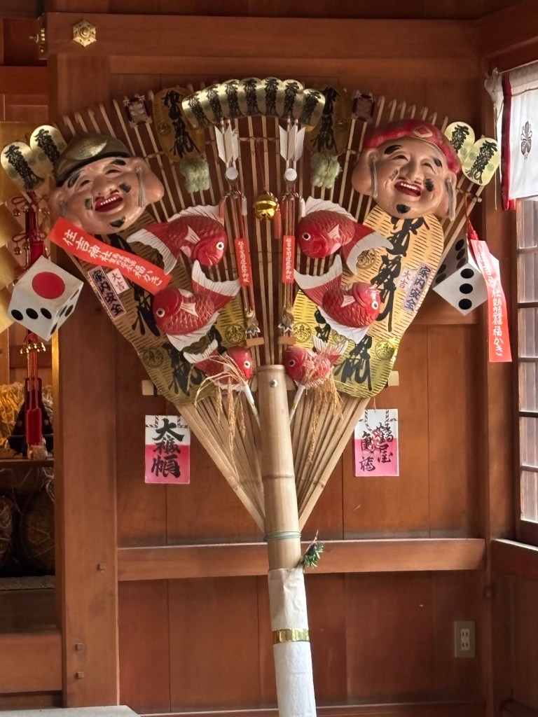 Puis une fois les ablutions faites on peut alors s’approcher du temple et voir les sur des sortes râteau en bambou des personnages insolites aux figures rigolotes avec des poissons rappelant que le temple est dédié aux pêcheurs.