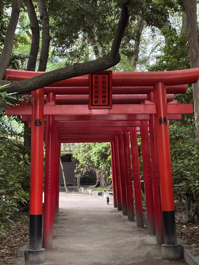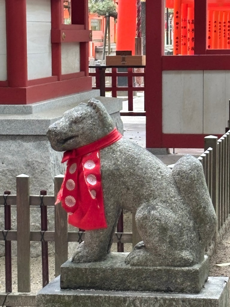 Puis j’ai continué ma visite et j’ai rencontré sur mon chemin un kami tenant un poisson et je suis passée sous les Tori rouge pour m’enfoncer dans le jardin.