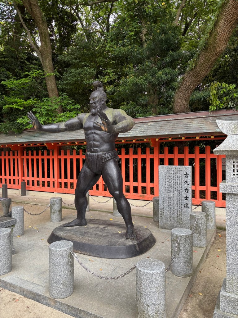 Cela commençait fort car je ne savais pas que le dieu de Sumiyoshi est celui de la culture, de la fortune, de la prophétie et des marins mais aussi celui des Sumo. Je le découvrirais devant la statue d’un lutteur Sumo. Le sumo était pratiqué comme un rituel Shinto. Ces deux mains ouvertes où les lignes de la main sont visibles forment un Kanji qui symbolise le pouvoir. Il est recommandé de toucher le corps et les mains pour ressentir l’énergie et les esprits qui en émerge.