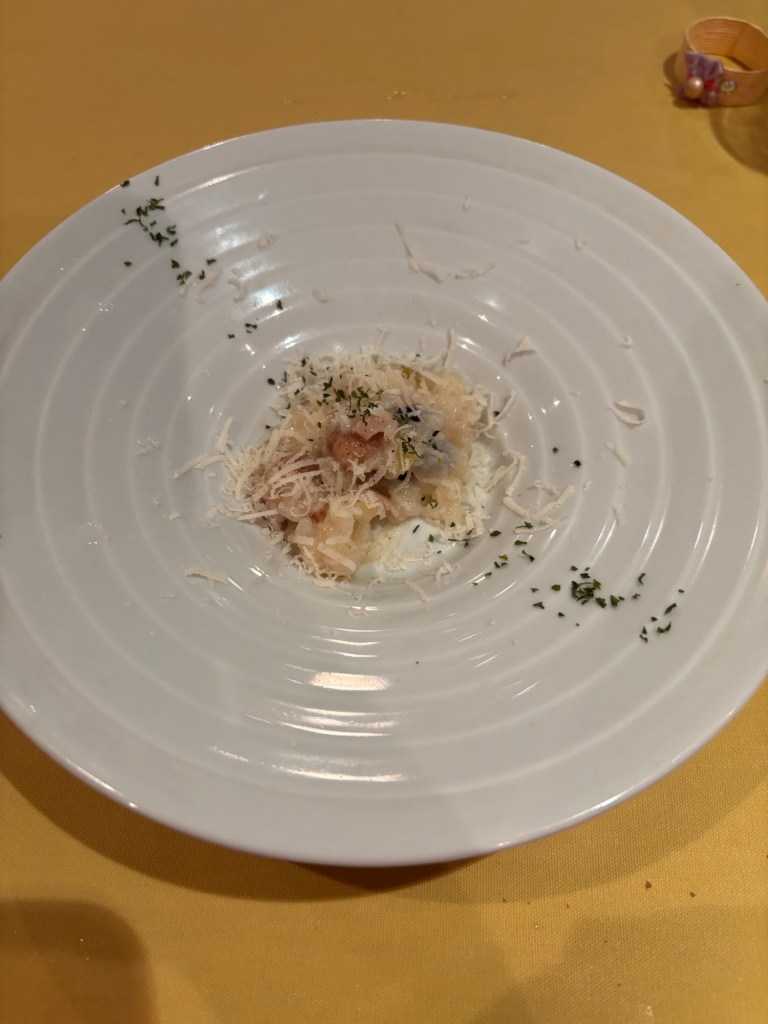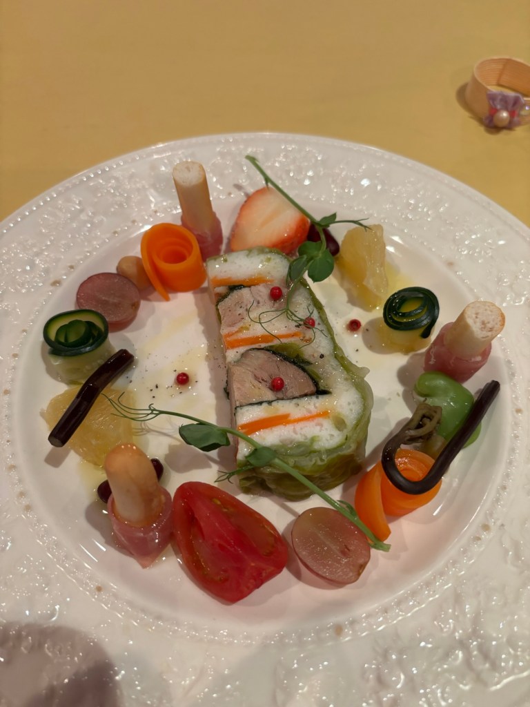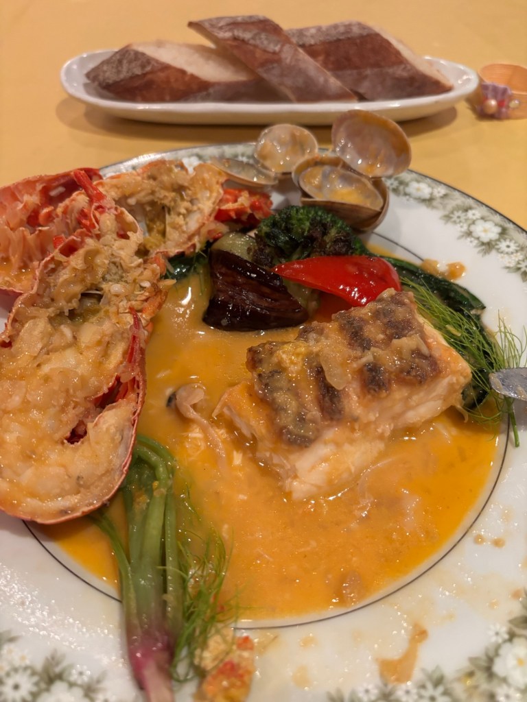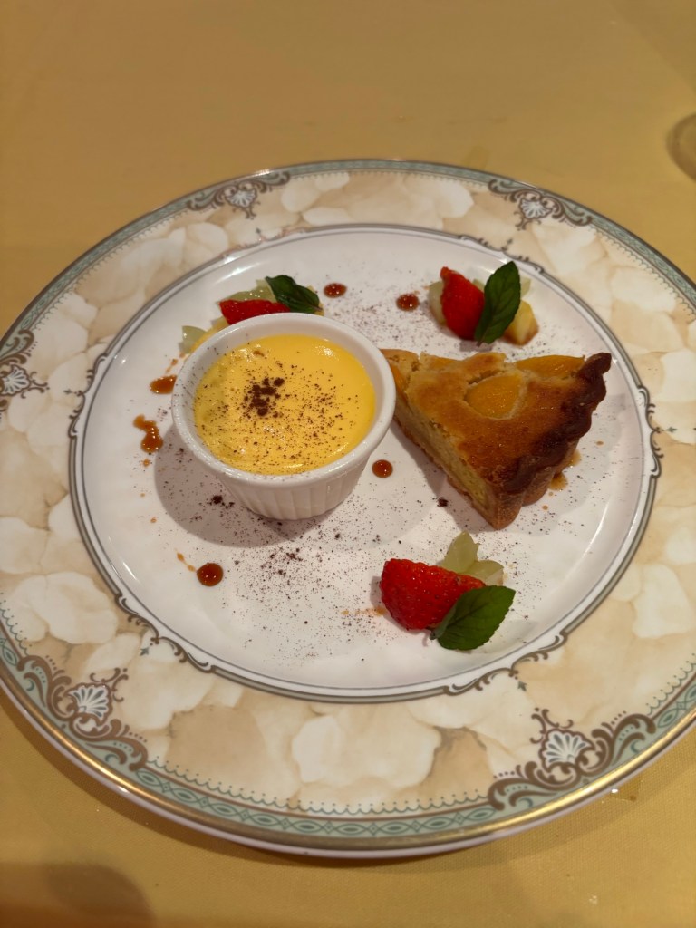 Le plat principal est le Ise Lobster ou la langouste Ise avec un poisson du jour (ne me demandez pas le nom j’ai oublié). Les plats commencent par une mise en bouche avec des couleurs, des légumes, puis de la soupe, du bœuf de Kagoshima en fines lamelles agrémentées de salade, un risotto et un dessert dont la base est une crème au lait et une tarte aux abricots. Je peux vous dire que tout cela fond dans la bouche, que c’est un artifice de saveurs en bouche.