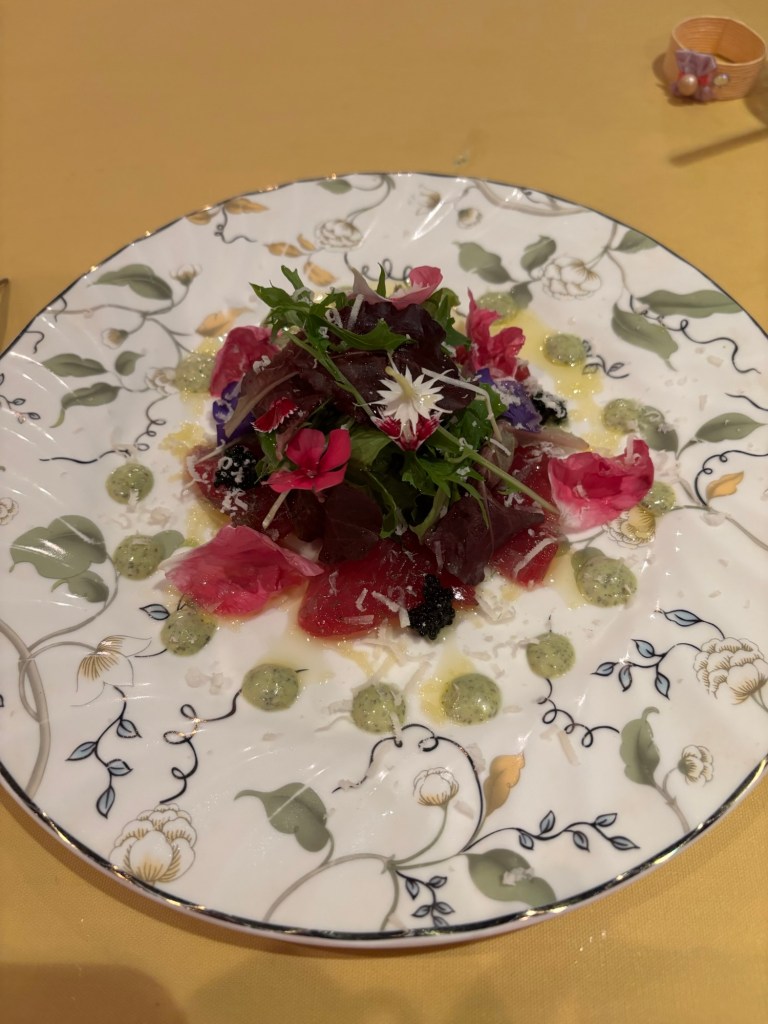 Si vous regardez de près l’assiette du bœuf de Kagoshima avec les herbes vertes (dessins) et les boules vertes à base de wasabi et les couleurs contrastantes des lamelles de bœuf – rouge, des fleurs comestibles blanches et de la salade verte – vous avez une œuvre d’art !