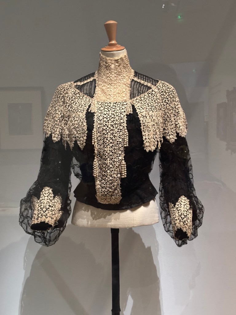J’ai trouvé les broderies extraordinaires comme celles de ce corsage noir où jabot et manches sont décorées de ces dentelles blanches. La finesse est juste merveilleuse.