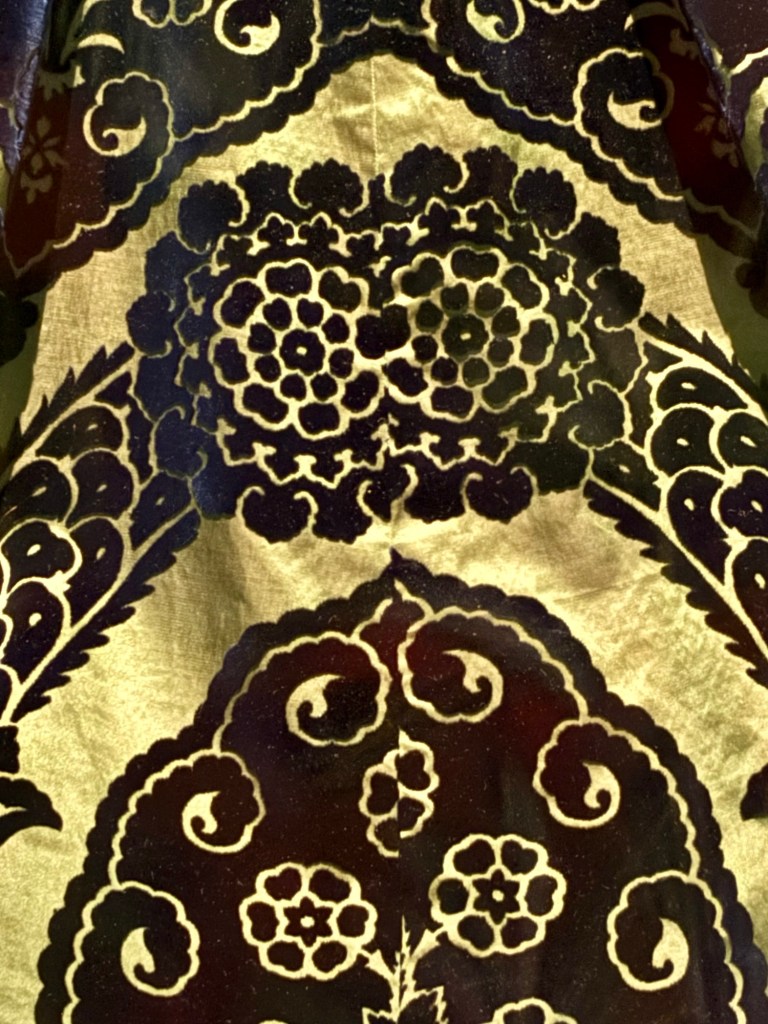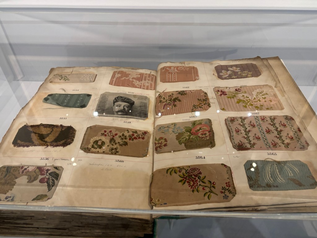 Et surtout on peut apprécier de voir que les soieries lyonnaises ont été développées tout en admirant le catalogue exposé avec des inédits et les tirelles en velours et les longs métrages réalisés par Tassinari & Chatel. Cela me fait penser à mon grand-père qui avait ainsi des échantillons en velours et damassés.