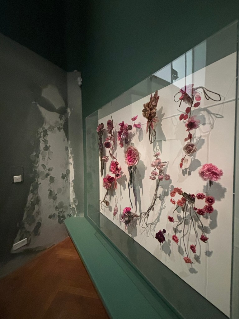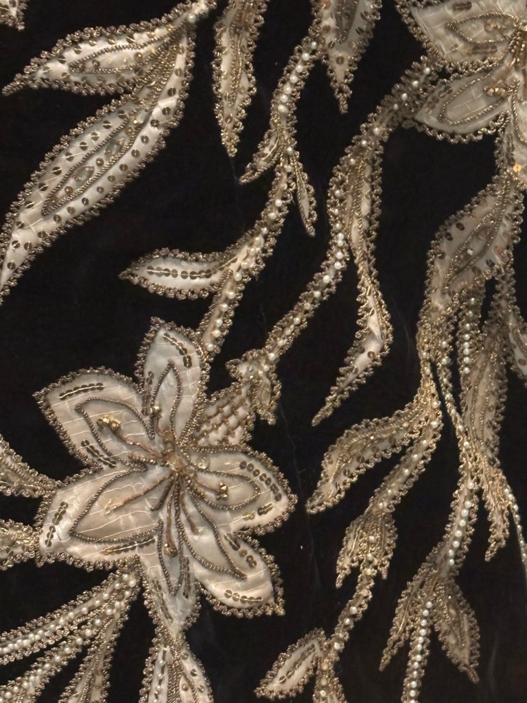 Quand on regarde le travail des brodeuses et toute la magnificence de ces réalisations on tombe en pamoison. Que de détails : perles fines, feuilles avec liserés de broderies. Les fleurs roses, œillets qui ornent une robe longue blanche.