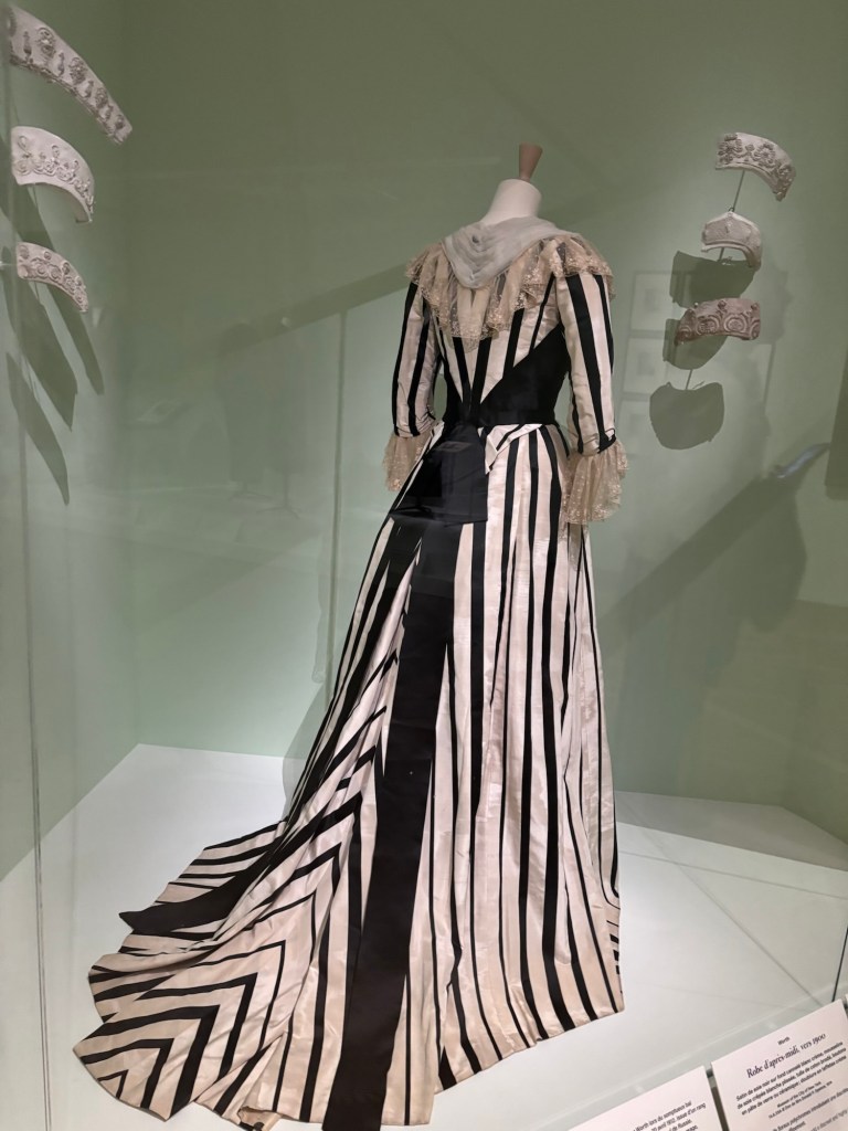 La robe à rayures noires et blanches, portée pour thé, qui date de 1894 portée par Andrée Caroline Worth, montre toute la modernité et la fraicheur de cette création.