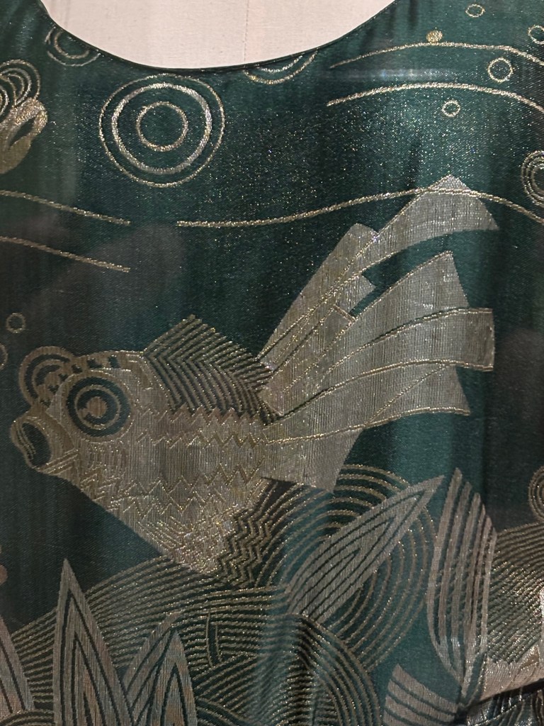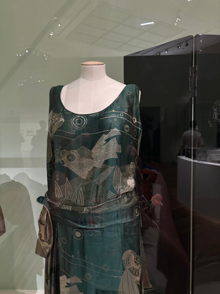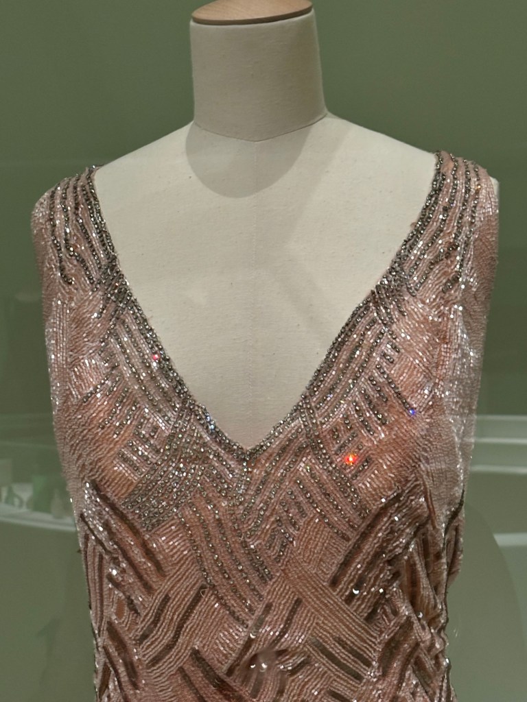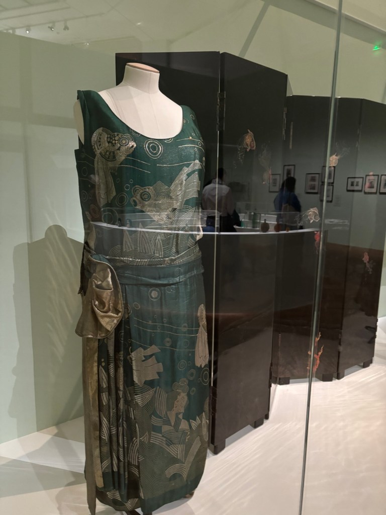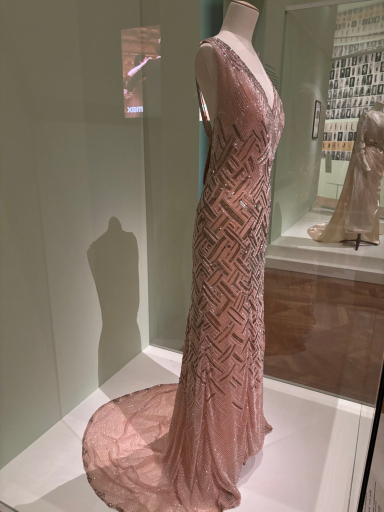 Puis les modèles des années trente m’ont ravies avec toute la pureté du drapé, le raccourci des tissus et les dessins Art Déco. La robe chinoise avec ses poissons et la robe du soir en mousseline de de soie et en tulle rose aux paillettes et strass ont remportés mon adhésion et mon admiration pour le travail effectué.