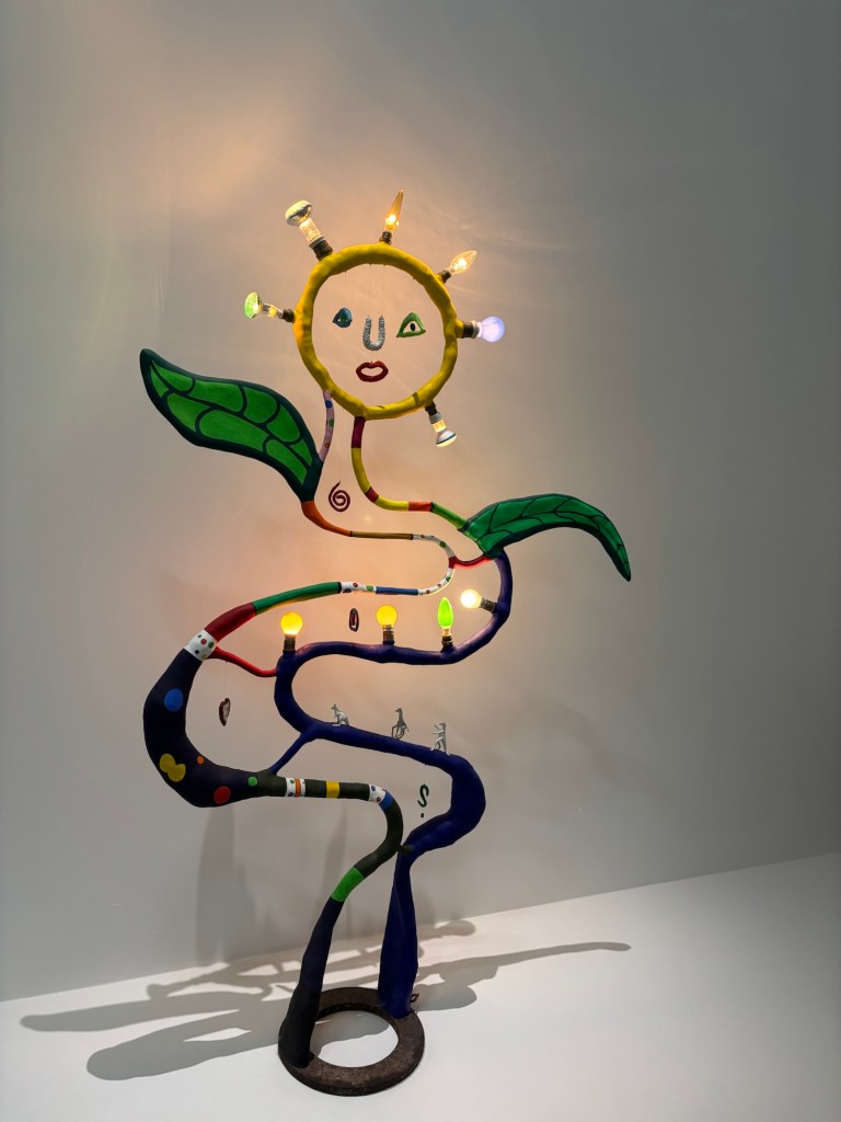 Dans ce rythme on trouve parfois une œuvre de Niki comme cette femme fleur feuille illuminée dont le corps permet à des animaux sauvages de grimper (girafes, kangourou). On retombe dans le monde de l’enfance à mes yeux.