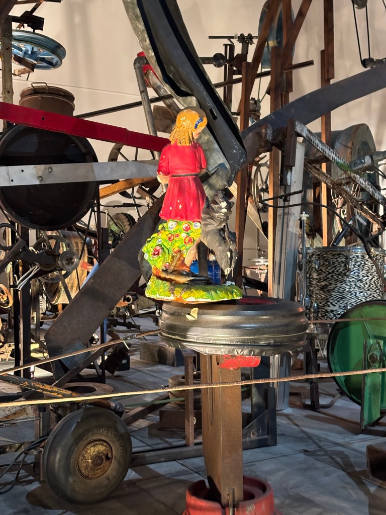 Et puis on entre dans les machines comme le crocrodrome de Zig & Puce en miniature. Ou bien les différents personnages imaginés et surtout le manège enchanté dit l’enfer, un petit début, qui tourne toutes les neuf minutes et offre un spectacle assez incroyable. Les poupées femmes ou hommes tournent sur eux-mêmes, les chevaux font de même chevauchant un terrain de ferraille, les lumières tournent elles aussi et tout le manège s’anime. Tenguely laisse libre cours à toutes ces animations en les rendant presque tous indépendants.