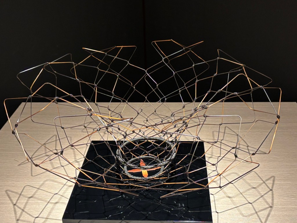Il y a aussi cet objet Utsuro ouvert et moderne réalisé par Sugiura Noriyoshi exprime la pureté et en même temps demande beaucoup de dextérité pour entrelacer les tiges fines comme des fils de fer du bambou.