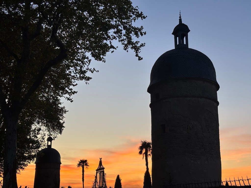 Les tours apparaissent comme des gardes du corps du château. Elles sont fières et droites comme des « i ». On aperçoit aussi des palmiers qui se détachent sur le rouge flamboyant du ciel.