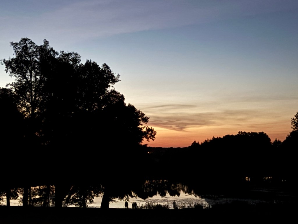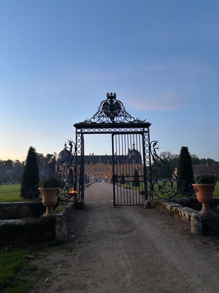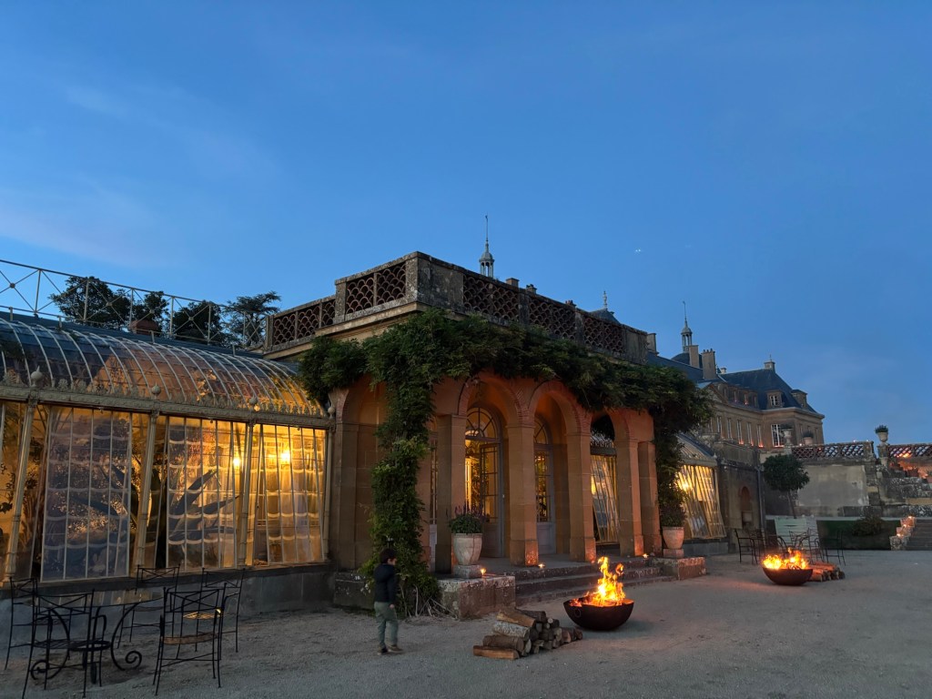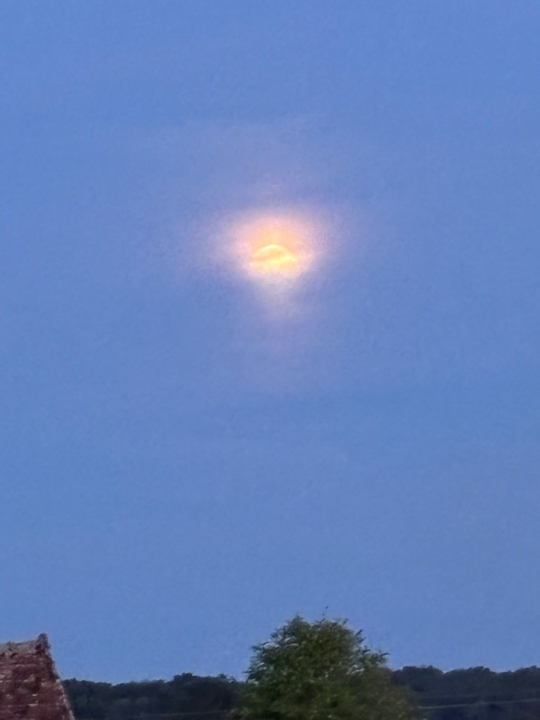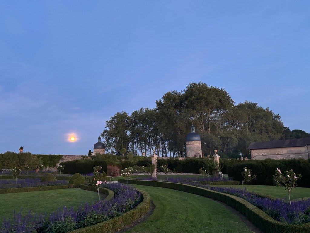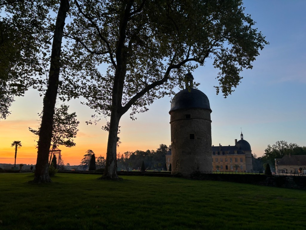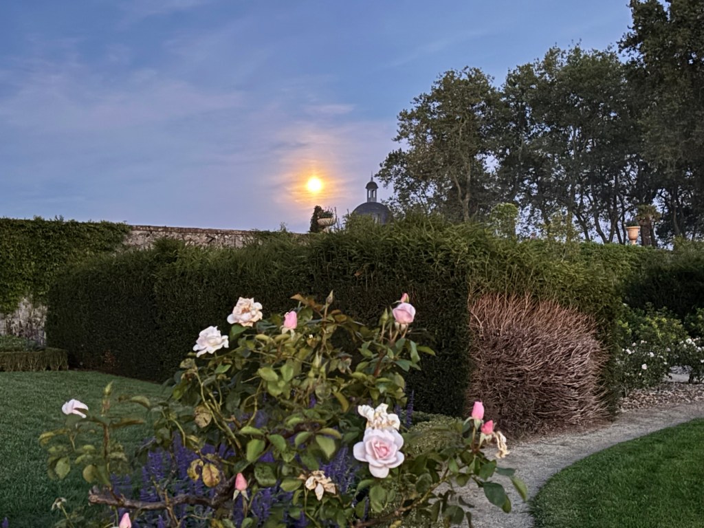 Nous sommes entre chien et loup – le moment où la luminosité tombe, la lune toute ronde et brumeuse se présente à nous et où le château s’illumine de mille feux. Et où le ciel est orange, feu. Impressionnant !
