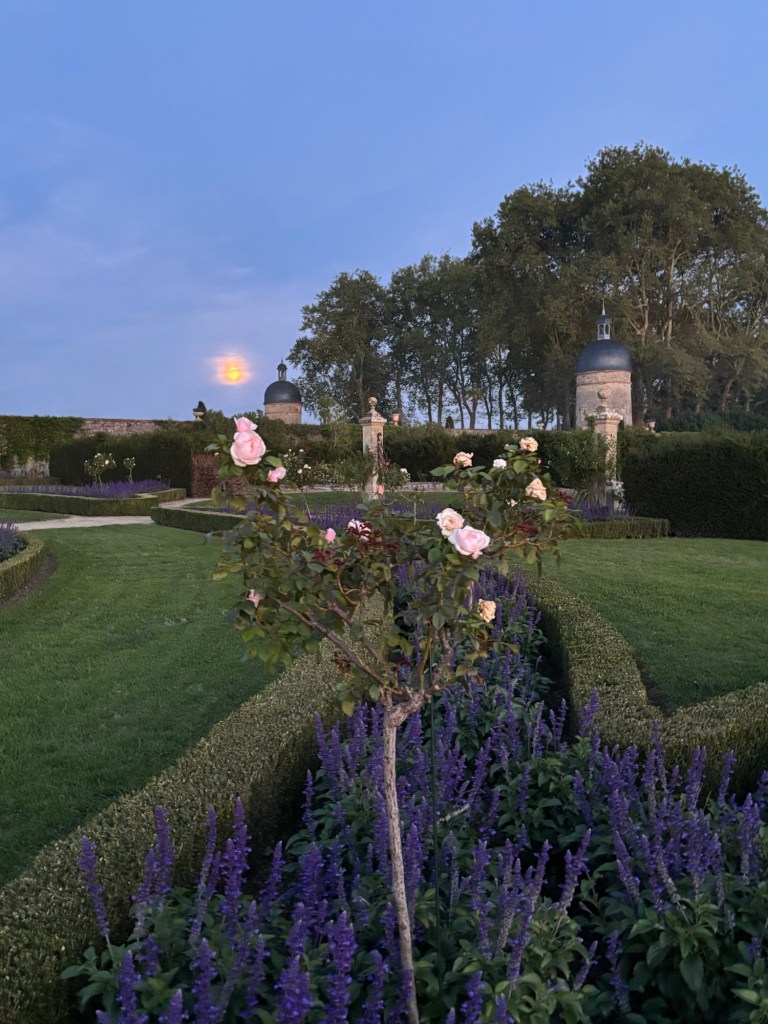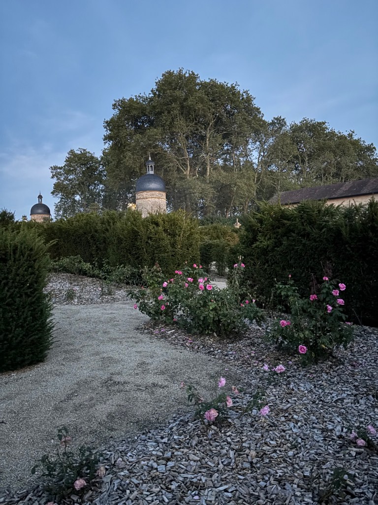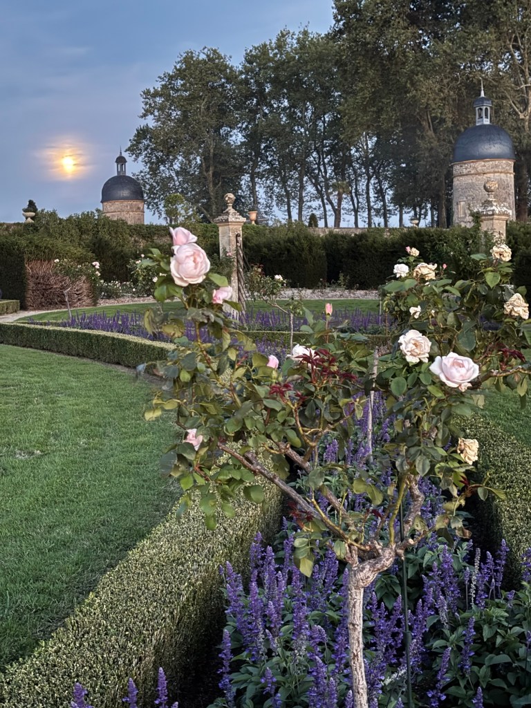 Des braseros de bois nous guident vers l’entrée du château. Mais avant je bifurque pour descendre vers la serre, la roseraie et le potager. Roseraie qui nous découvre ses rosiers où des roses sont toujours présentes et enchanteresses. Je parcours la roseraie entre ses parterres, ses labyrinthes colorés de lavande mauve et ses pièces d’eau.