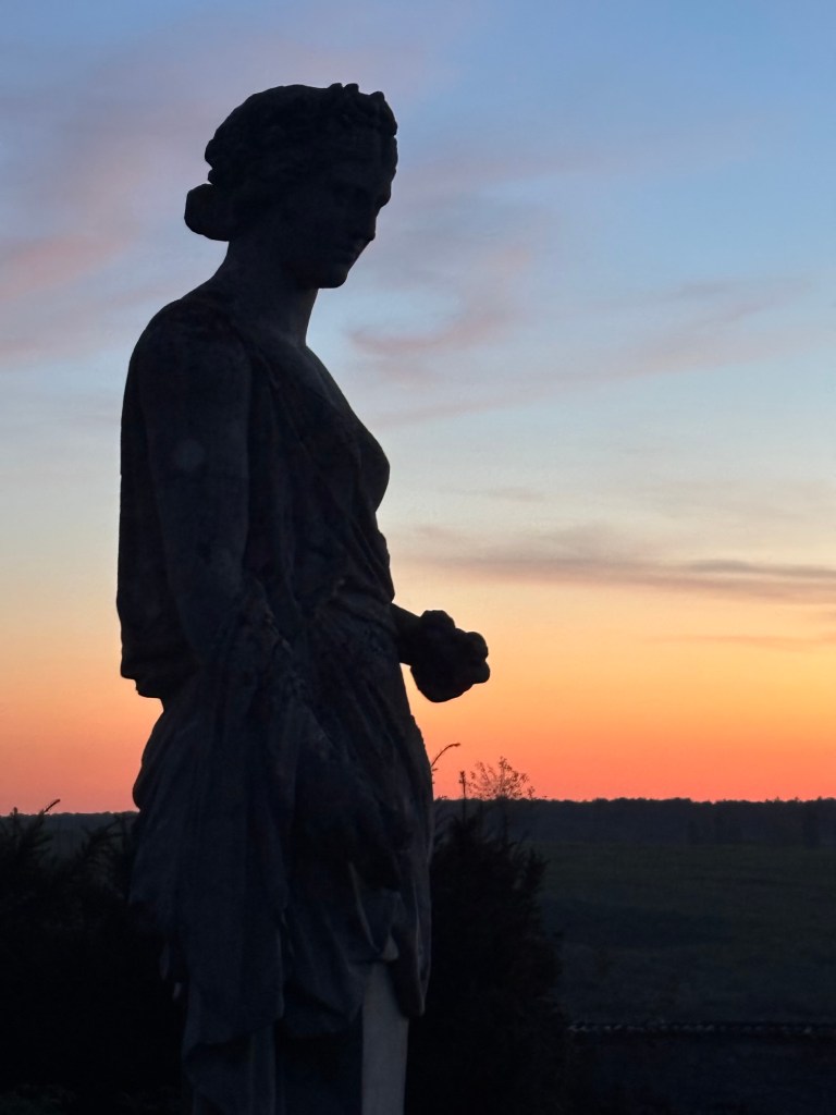 Ravissement des yeux et fraicheur qui vous entoure. Heureusement les braseros réchauffent et le bois pète et lance des flammes comme pour nous lécher. De jolies statues de femmes se parent des couleurs du coucher de soleil et se drape de mystère.