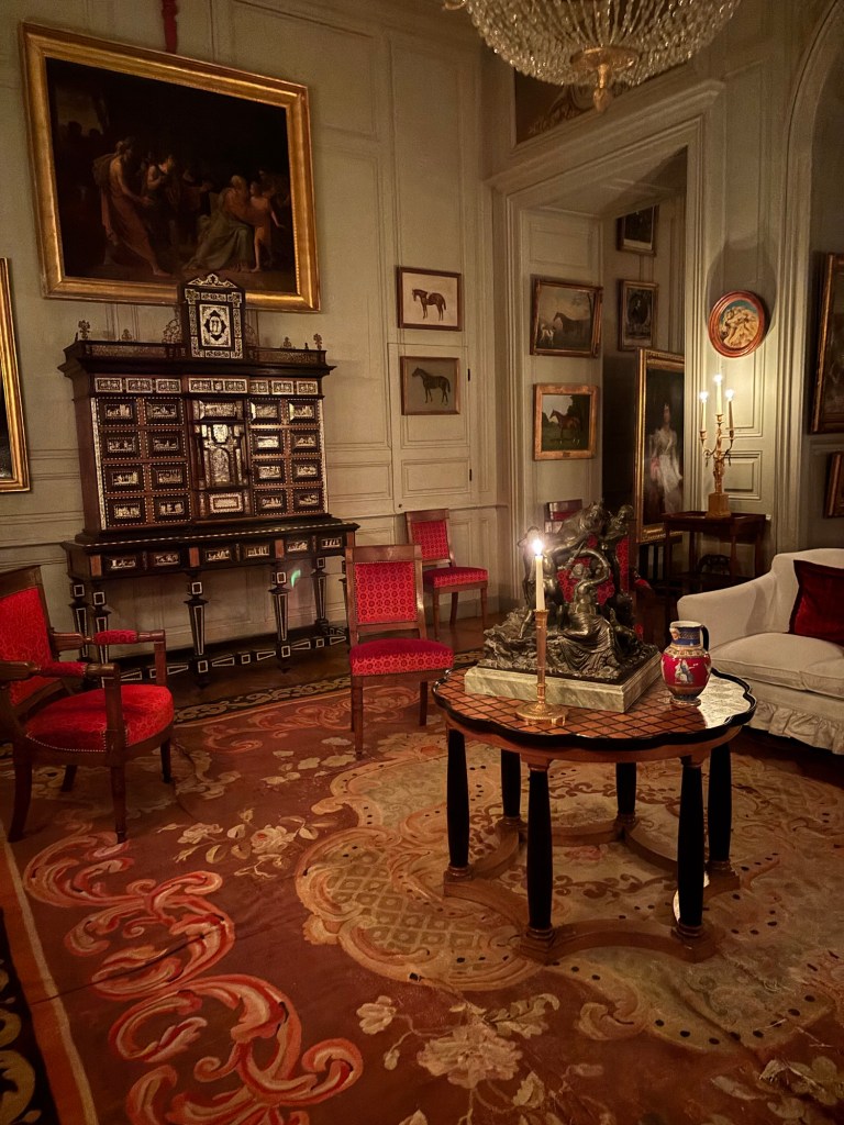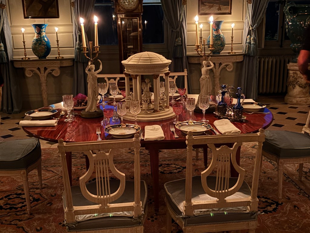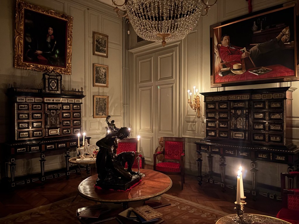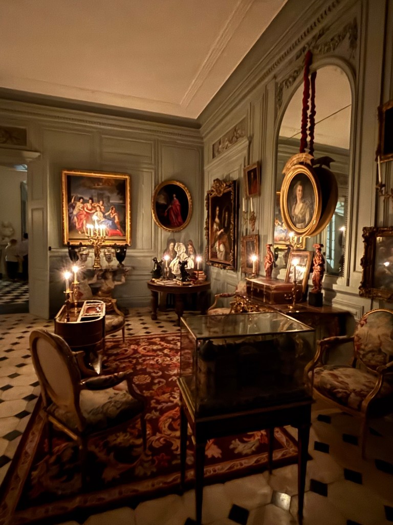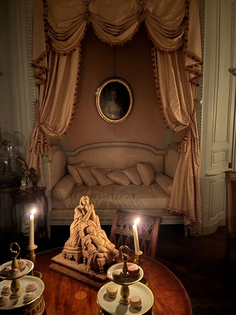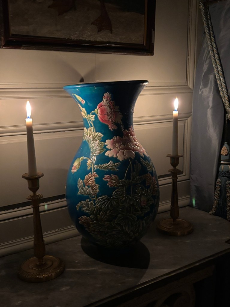 Il y a aussi ses trois secrétaires qui sont des opposés dans les dessins. Cela donne une atmosphère particulière aux pièces. On aurait envie de s’asseoir et de se pâmer comme les dames de cette époque. Les bougies font ressortir les vases en porcelaine de chine turquoise ou bien les statues.