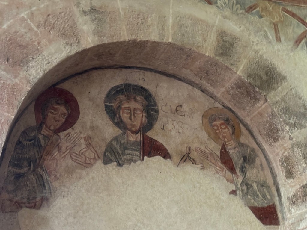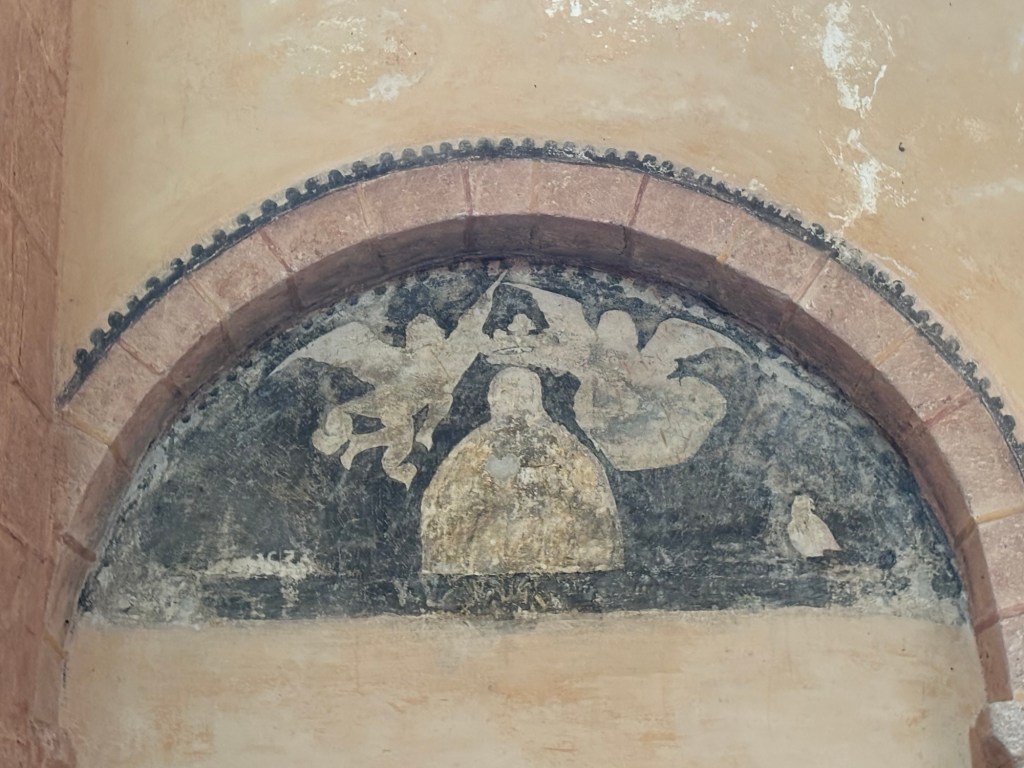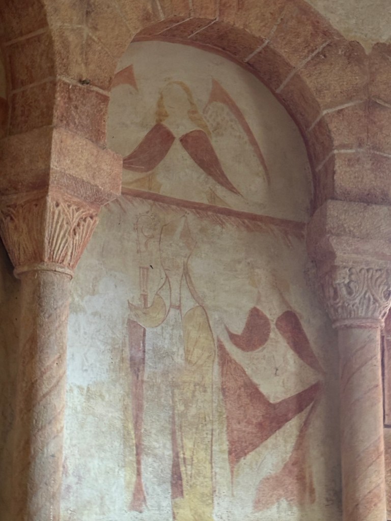 En suivant les lieux, on découvre un prêtre ou un évêque avec son diacre et des anges au-dessus de lui. Là aussi la douceur des couleurs entre le roux et le jaune œuf sont magnifiques.