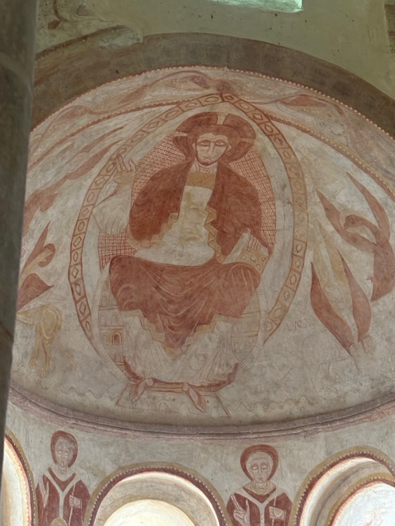 Quand vous ouvrez la porte et que vous entrez vous êtes surpris de découvrir devant vous au niveau du chœur, le Christ en majesté flanqué du tétramorphe sur un trône dont on ne voit pas l’assise – comme en méditation.