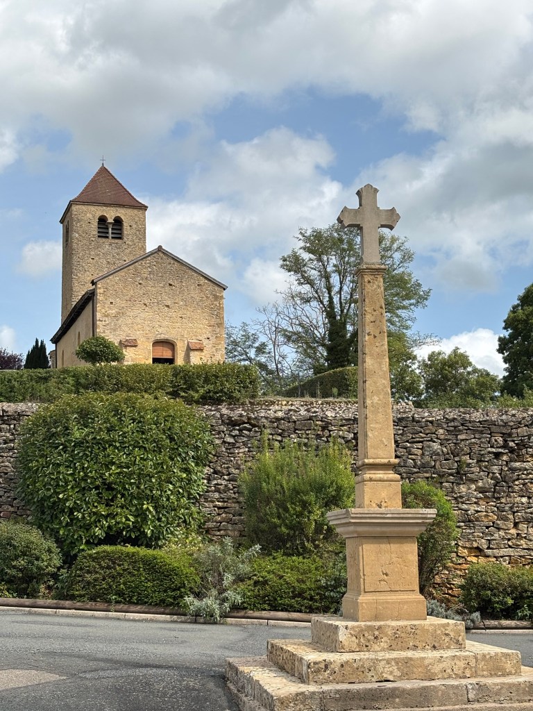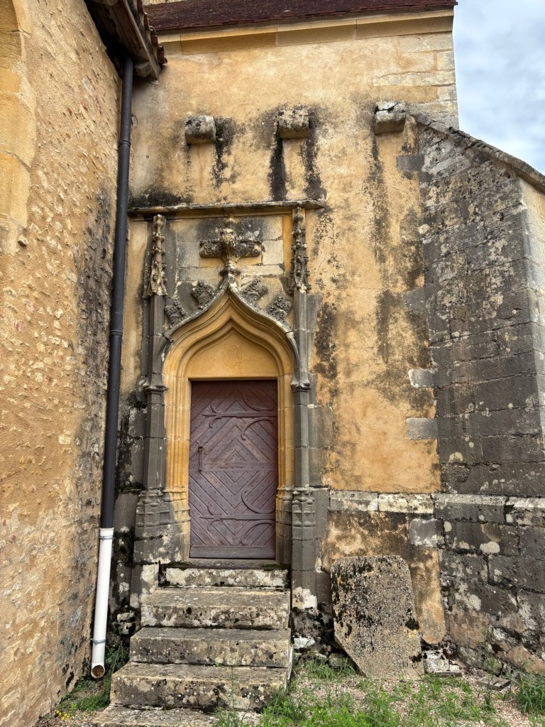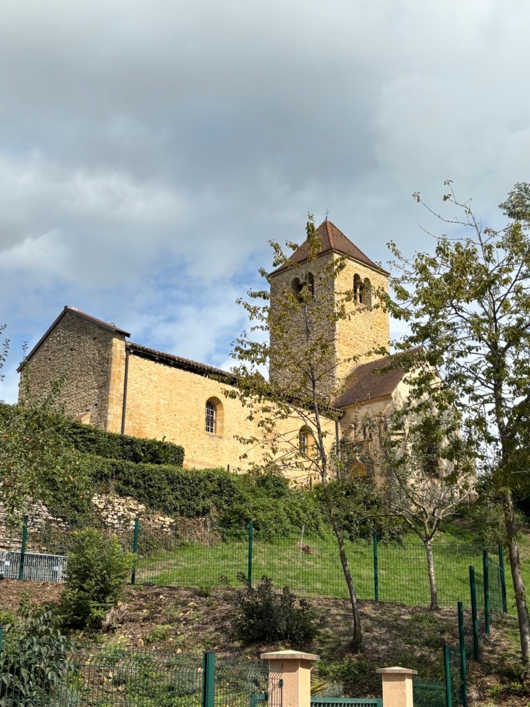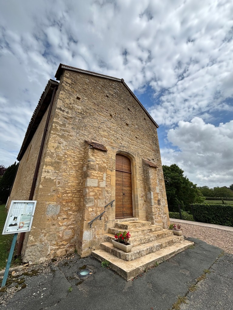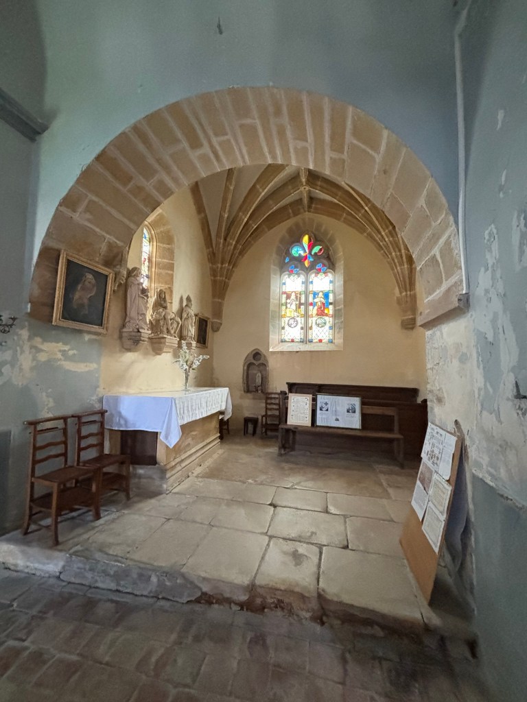 De retour de la balade je suis allée visiter l’église Saint-Pierre aux liens dont la chapelle de la façade sud est de style gothique, très belle et simple en extérieur mais moins travaillée en intérieur. Un plafond plat en bois. Elle évoque Saint-Pierre se délivrant des chaines alors qu’il était prisonnier. Construite au 11e et 15e siècles par les moines de Cluny où ils ont laissé des témoignages sur la façade ouest. (Pierres en arrêtes de poisson). Les vitraux qui sont d’époque sont magnifiques. En sortant on a une vue incroyable sur la vallée.
