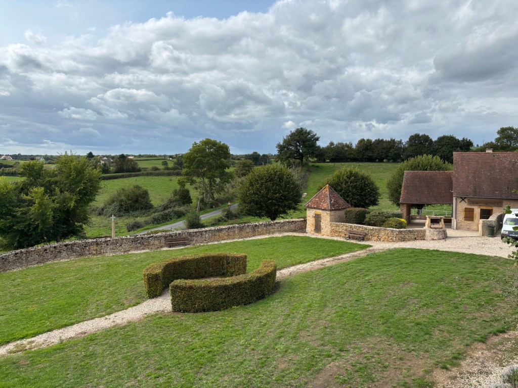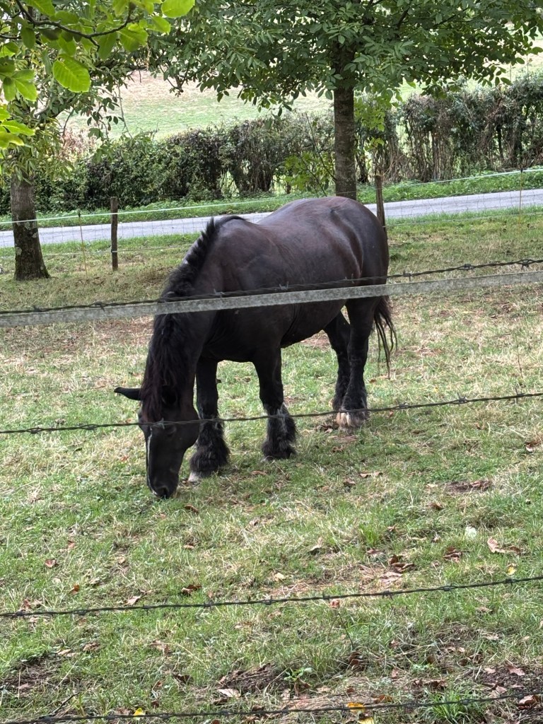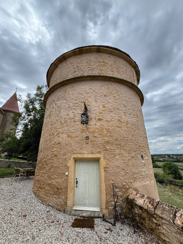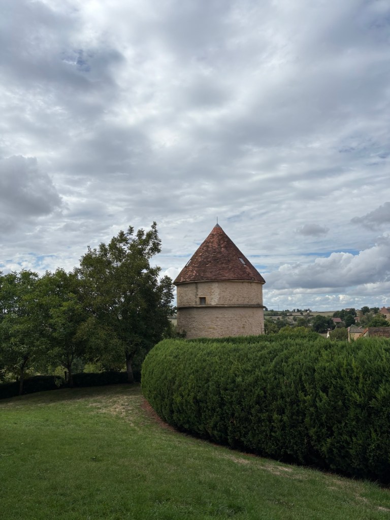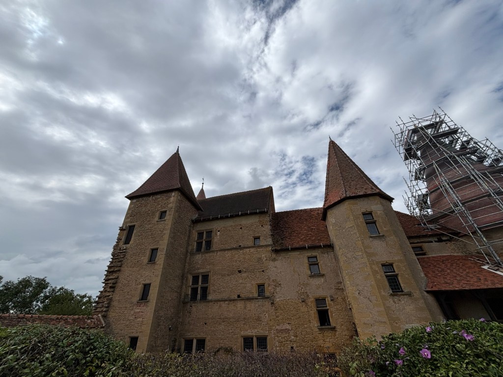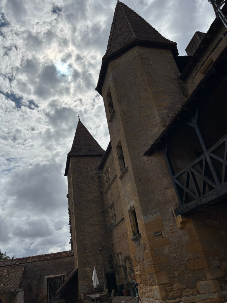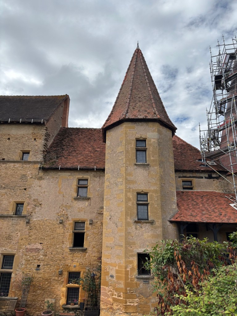 Des tours très pointues, une tour est restauration (toiture) et l’aspect en est très sévère. Un colombier en contrebas où une chambre d’hôtes à été installée avec vue imprenable sur la vallée. Et juste à côté une écurie avec un cheval noir.