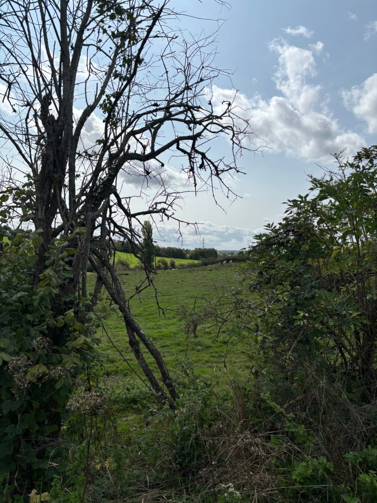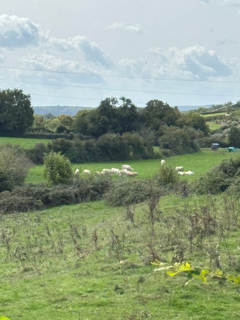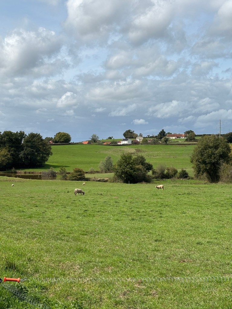Mirer le paysage ondoyant est un plaisir : bosquets sur les pentes, pâturages verts comme si une tondeuse était passée et les nuages dans le fond finissait le tableau. Les verts se déclinent entre le vert clair, pomme ou bien foncé pour donner de la féérie à la luminosité. Par endroits le ciel était brossé de nuages et les vallons semblaient encore plus pentus. Que la nature est belle et reposante.