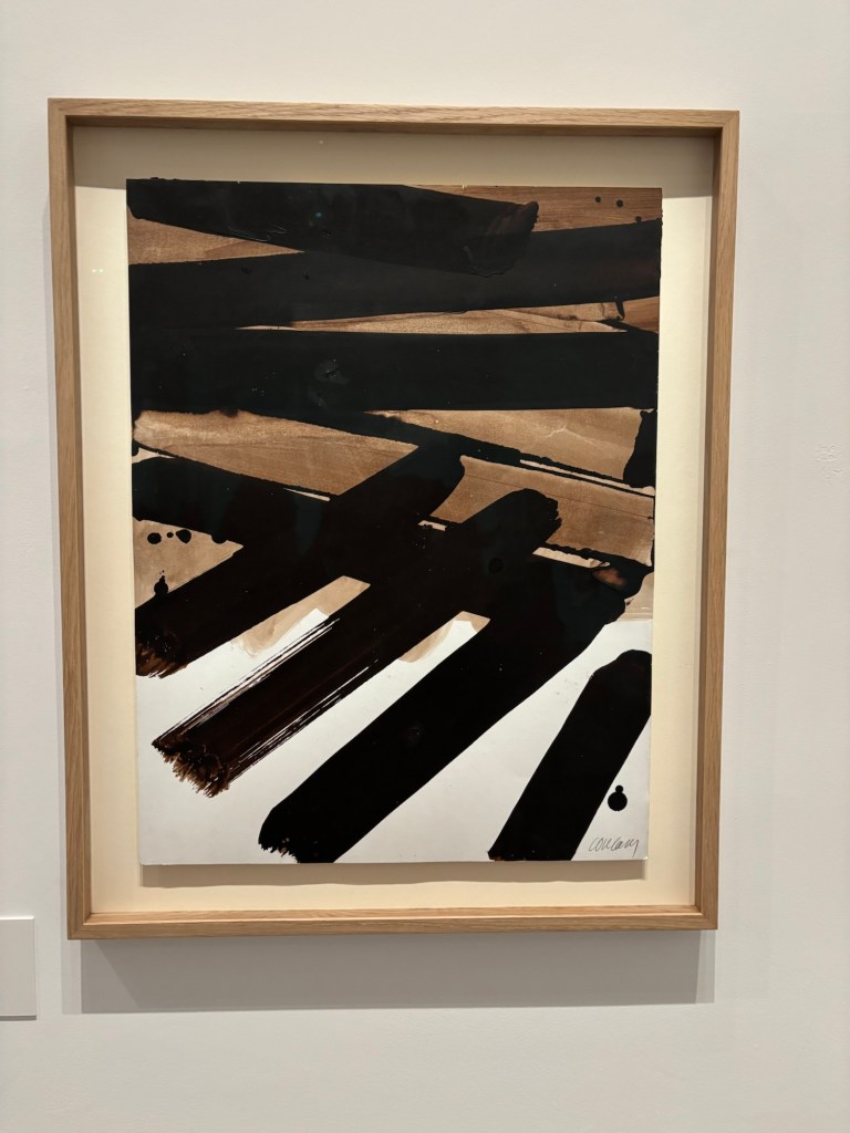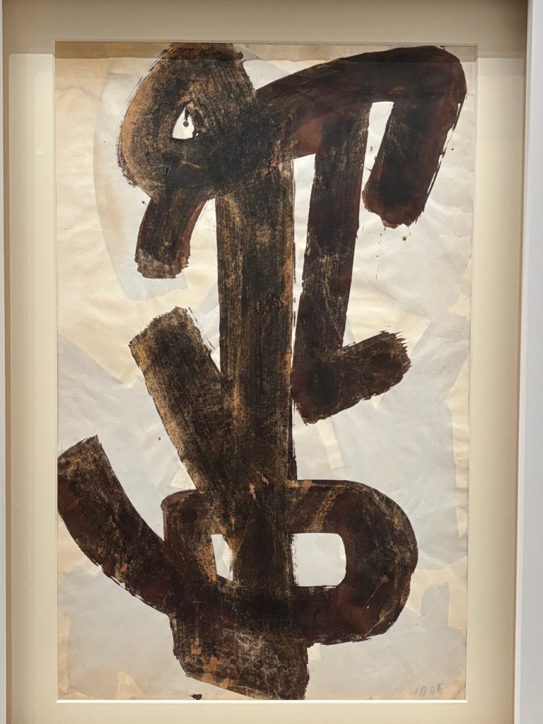 Ici on peut voir les premières œuvres de Soulages sur papier et surtout sur papier marouflé avec du brou de noix qui va du marron clair au plus foncé et noir.