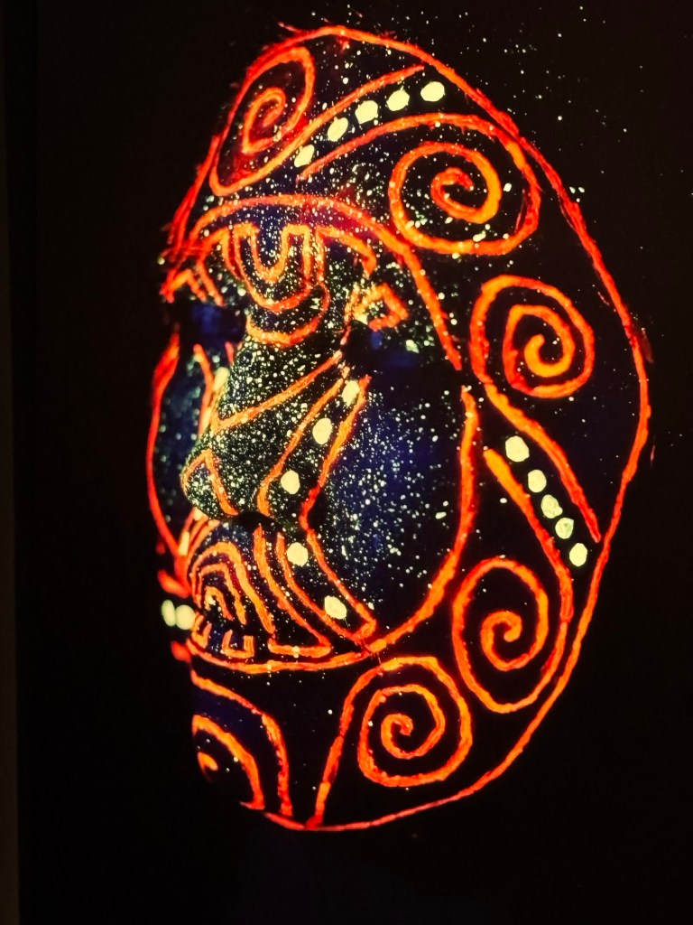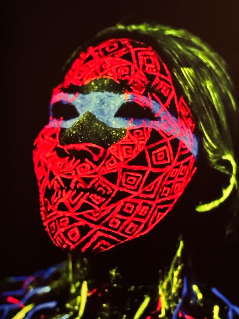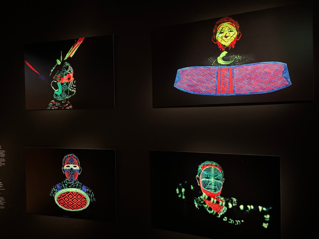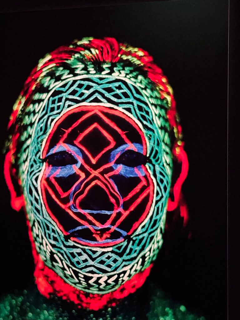 Puis on a la vision des masques sur les visages et surtout des peintures qui se reflètent devant nous et nous charment par leur beauté. Ce sont des portraits de chamanes, guérisseurs issus de peuples du Rio Negro. Le graphisme des peintures est réhaussé de peinture fluorescente pour nous cheminer dans le côté spirituel. L’autre face du monde. J’ai juste envie de parcourir ces visages et ces dessins et de pouvoir les suivre.