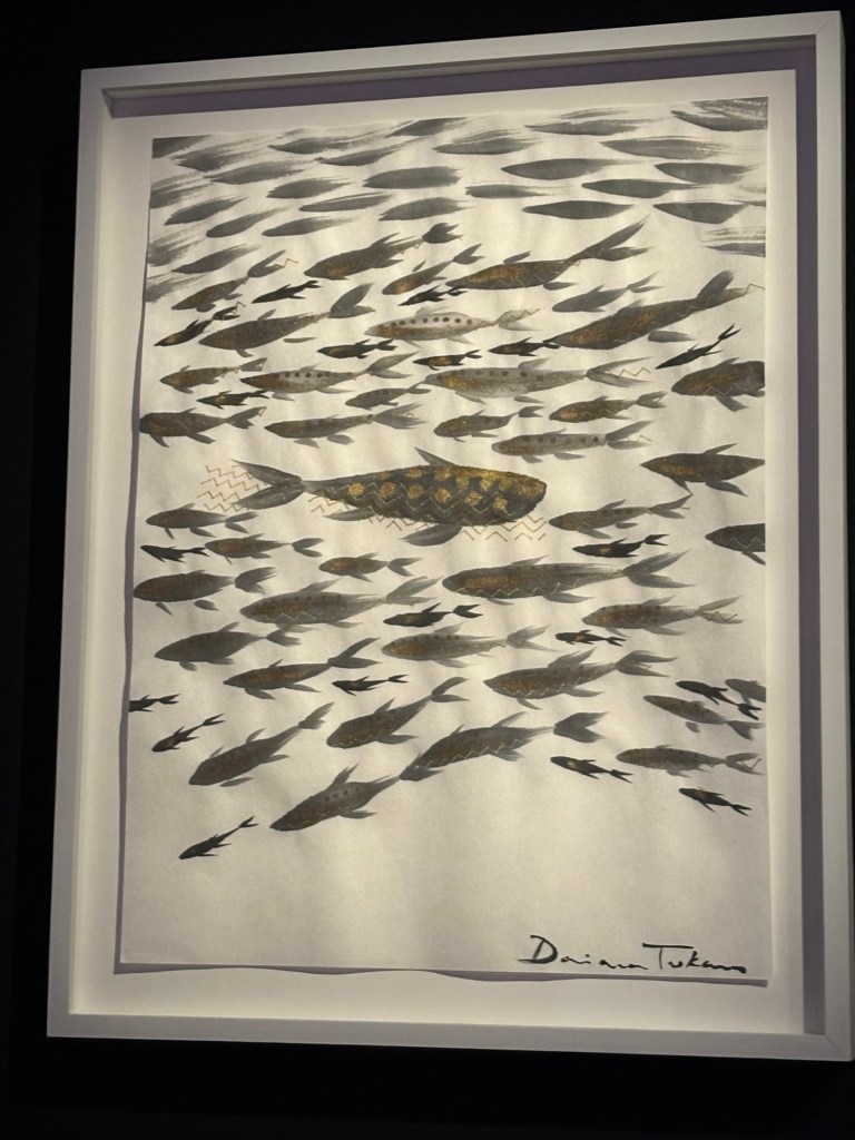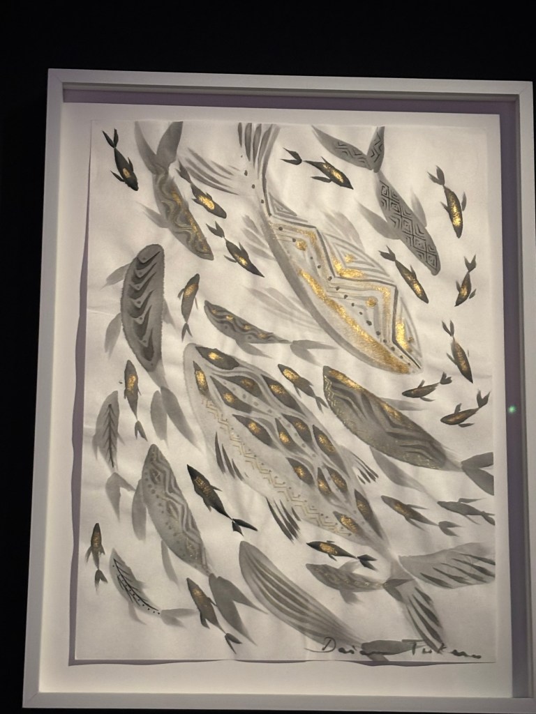 Puis en continuant cette exposition on est confronté aux animaux marins : poissons et baleines qui ont ravis mes yeux entre l’argenté et le doré.